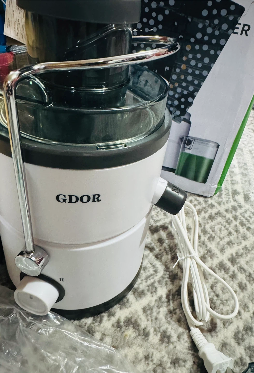 Selling a GDOR centrifugal juicer with a wide chute. It comes with the box and all the components you see in the pictures. It's perfect for making fresh juice at home