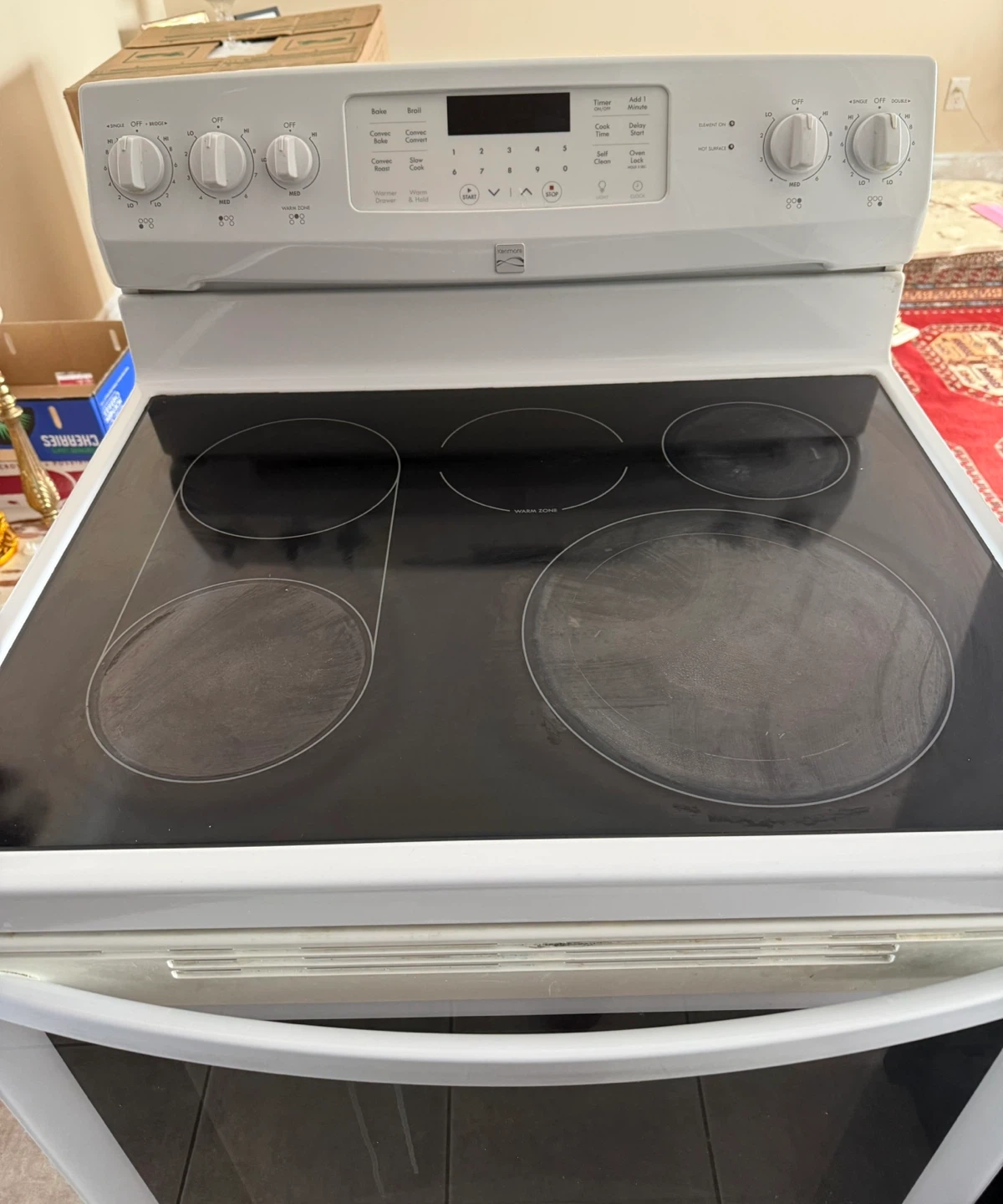 White Kenmore electric stove with a smooth cooktop. It features a convection oven with multiple cooking modes and a warming drawer. Digital display and controls are easy to use.
