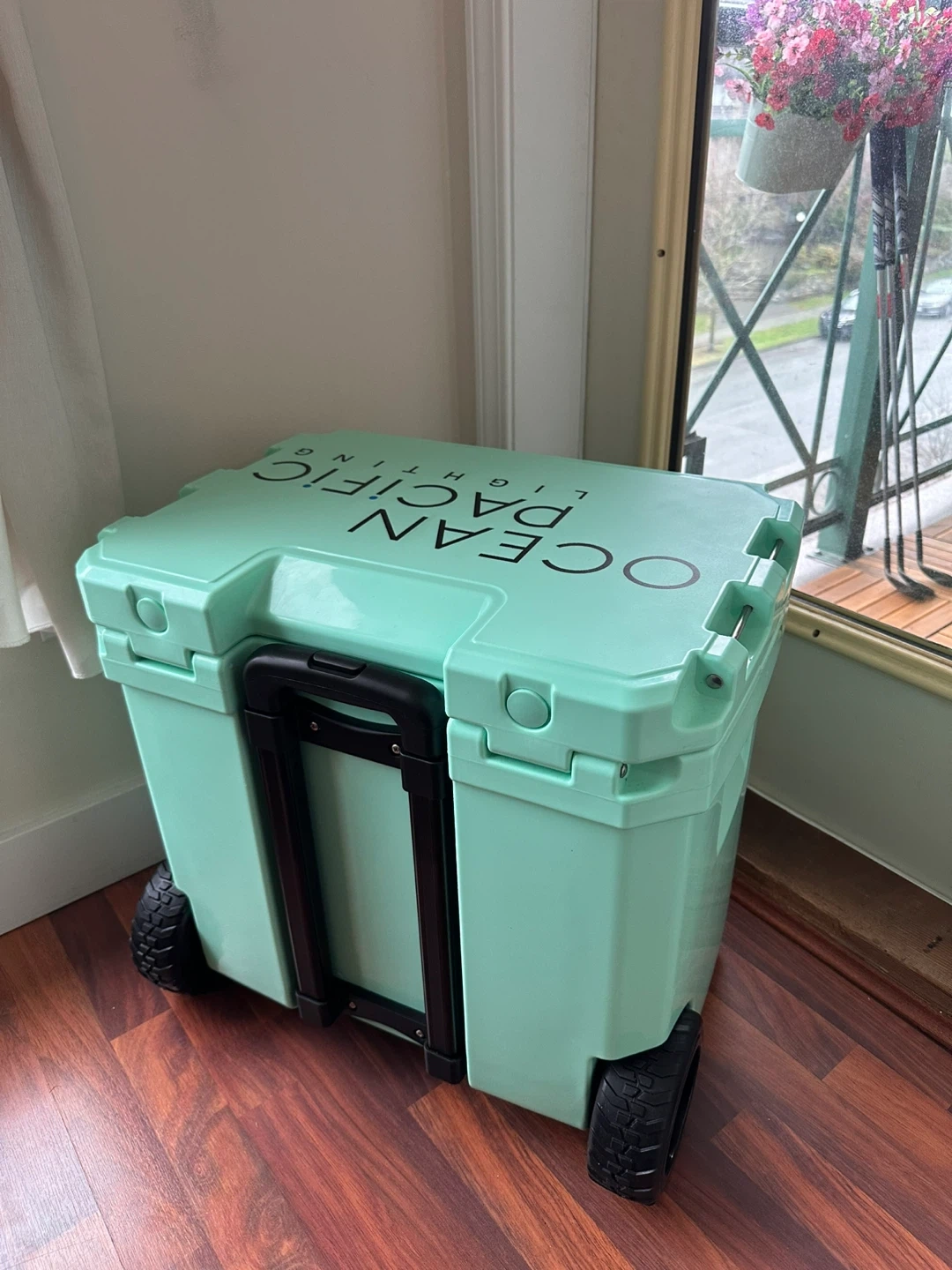 Chilly Moose 35L Wheeled Explorer ice box in a light mint green colour. It holds 35 litres or 1.2 cu ft, with ice retention for up to 5 days. It's perfect for camping trips or tailgating!