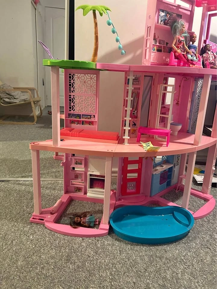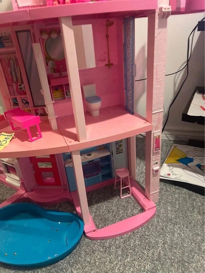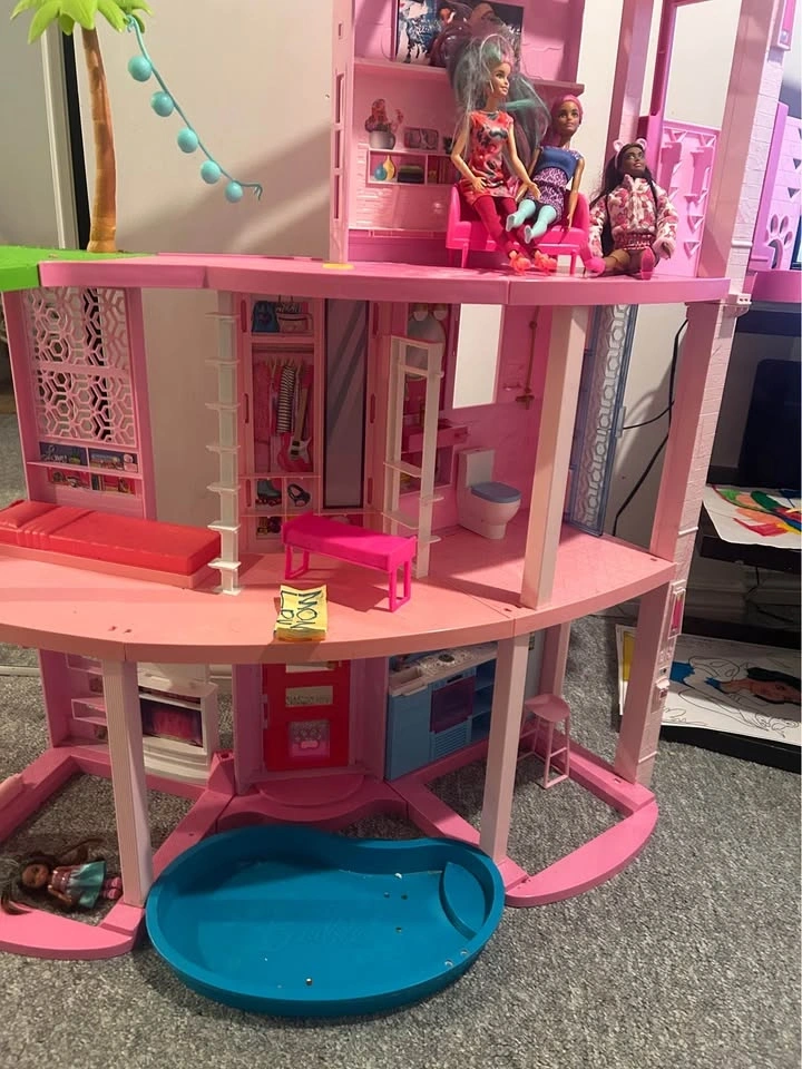 Well loved Barbie house. We have the slide and extra accessories (not pictured). It's dismantled halfway so it can fit in a small car or SUV. Can include dolls if needed.