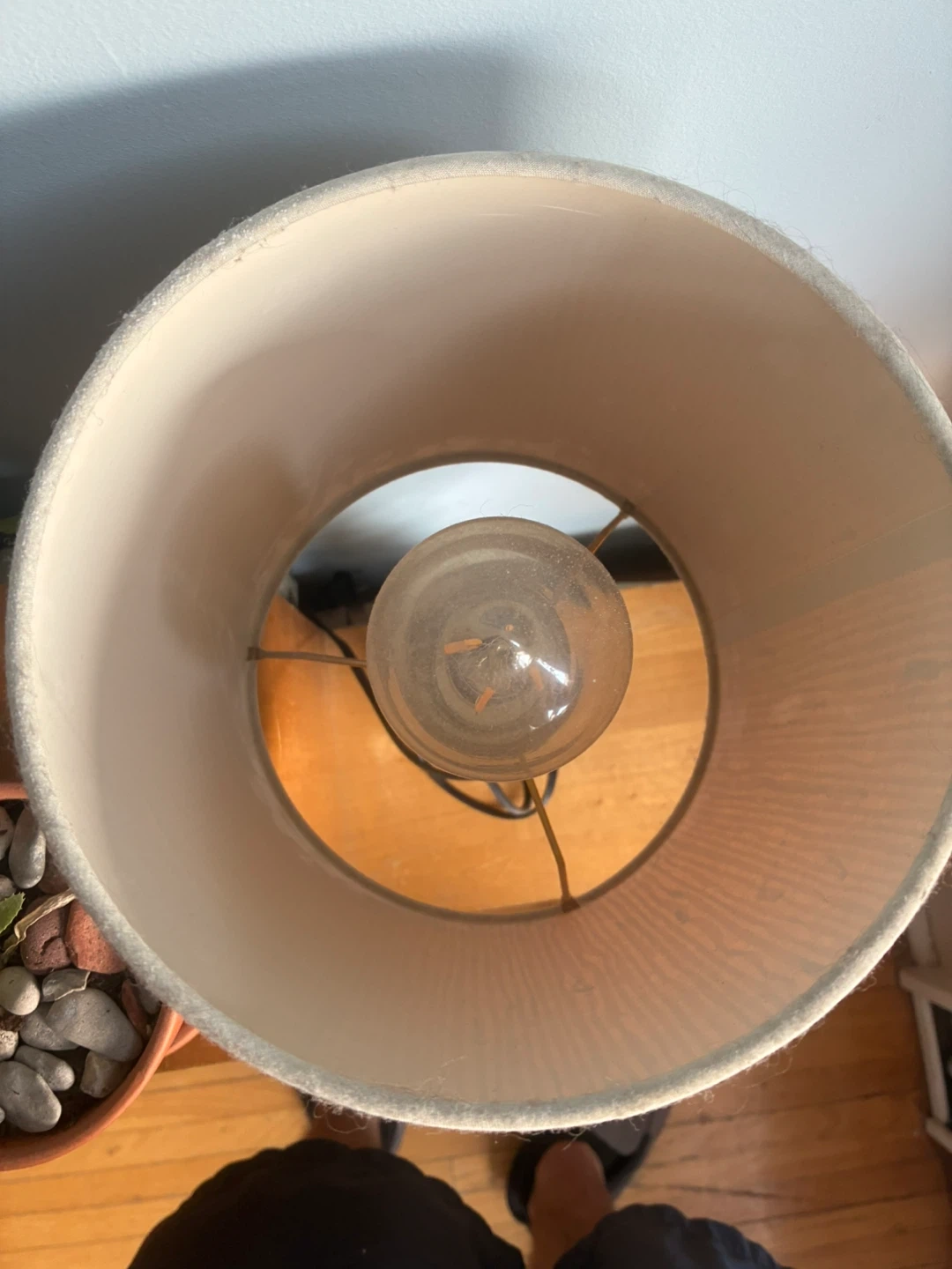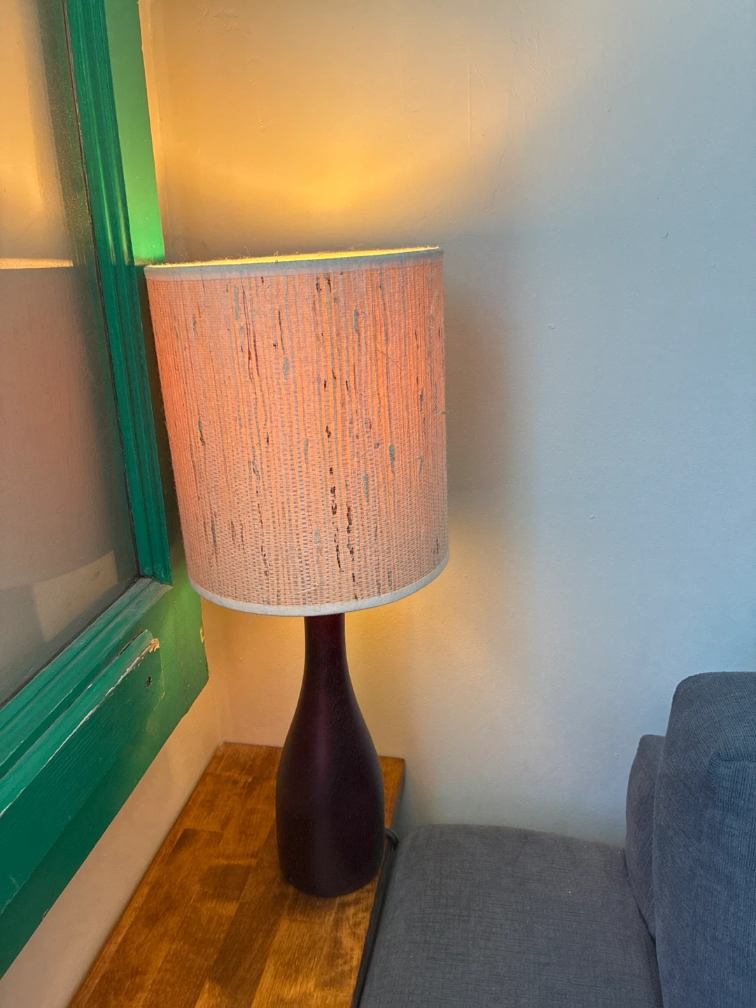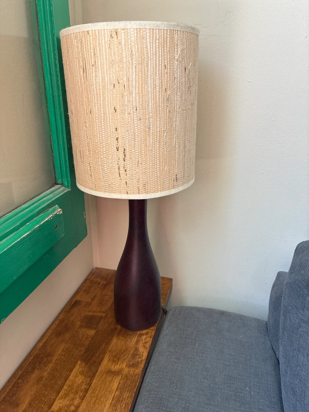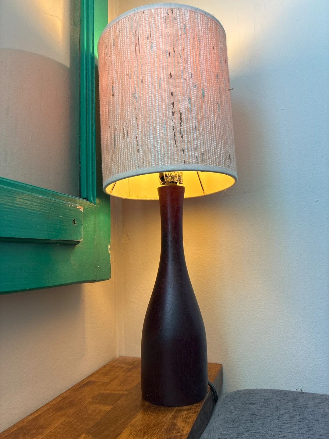 Table lamp with a dark wood base and a textured fabric shade. It provides a warm ambient glow when lit. Perfect for adding a cozy touch to any room.