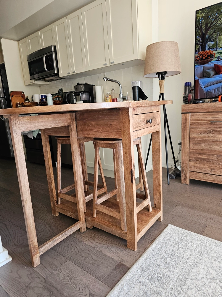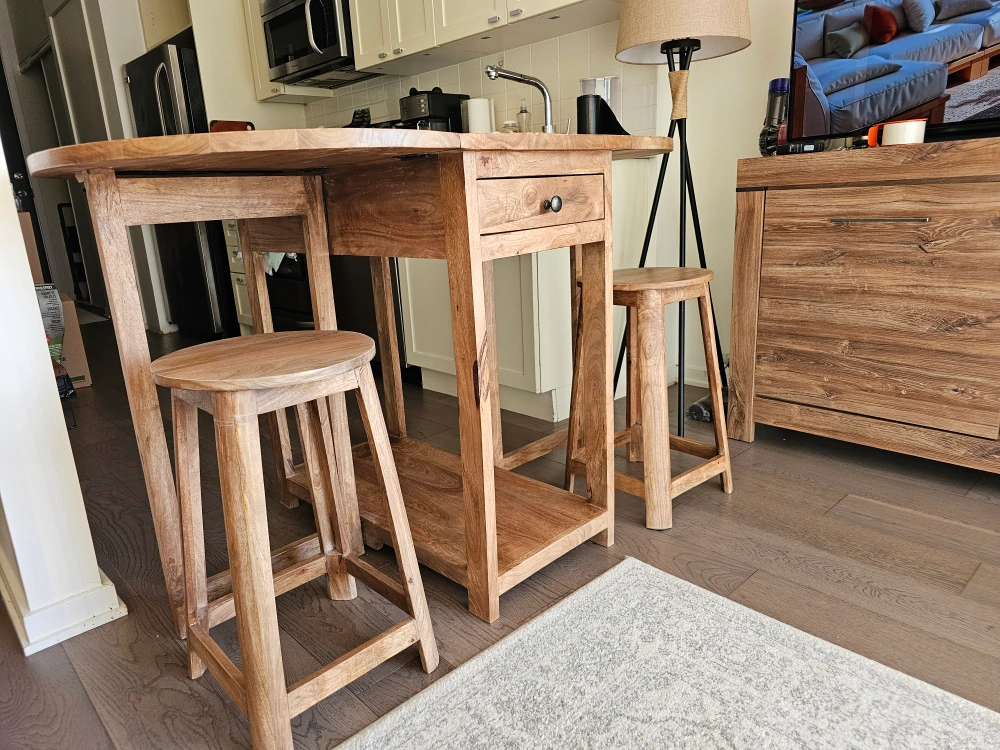 This wooden drop leaf kitchen island table comes with two matching stools. It features a convenient drawer for extra storage. The drop leaf design makes it adaptable for smaller spaces!