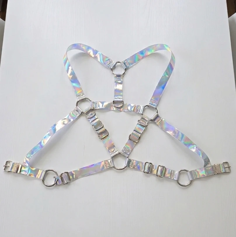 This holographic harness bra features adjustable straps and silver hardware. It's made from a shimmering, iridescent material. This accessory adds a unique flair to any outfit!