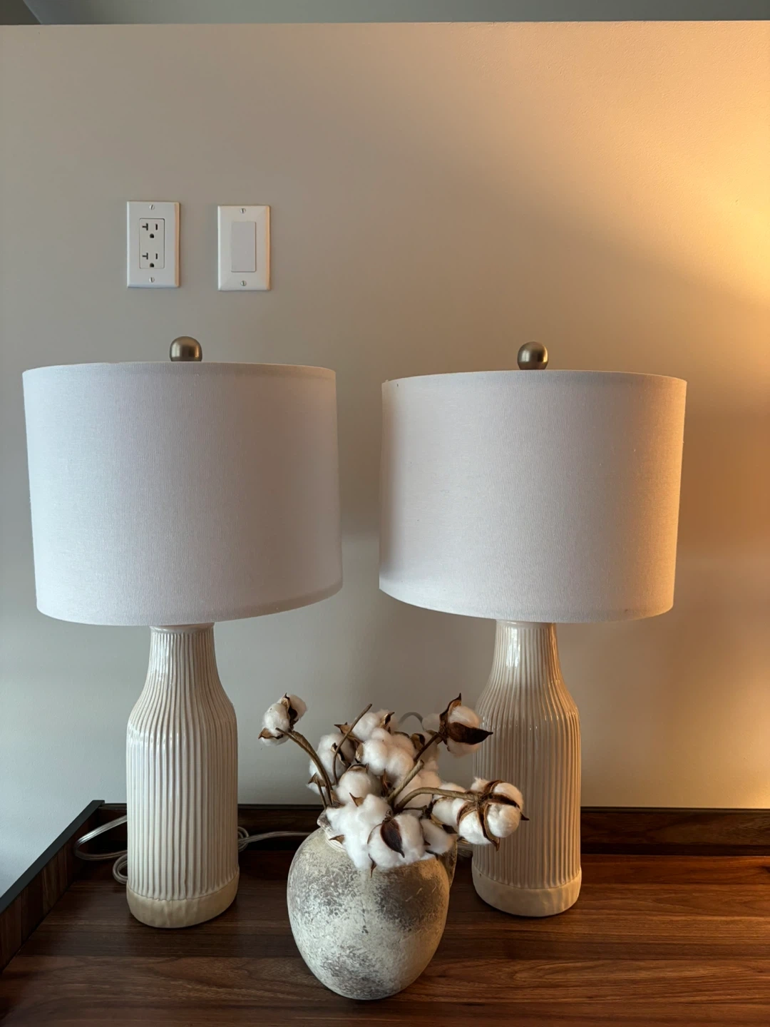 This listing is for a pair of ceramic table lamps. The bases have a ribbed texture and a cream-colored finish. Each lamp comes with a white fabric drum shade. These lamps are a great addition to any living room or bedroom decor. They provide a warm and inviting ambiance.
