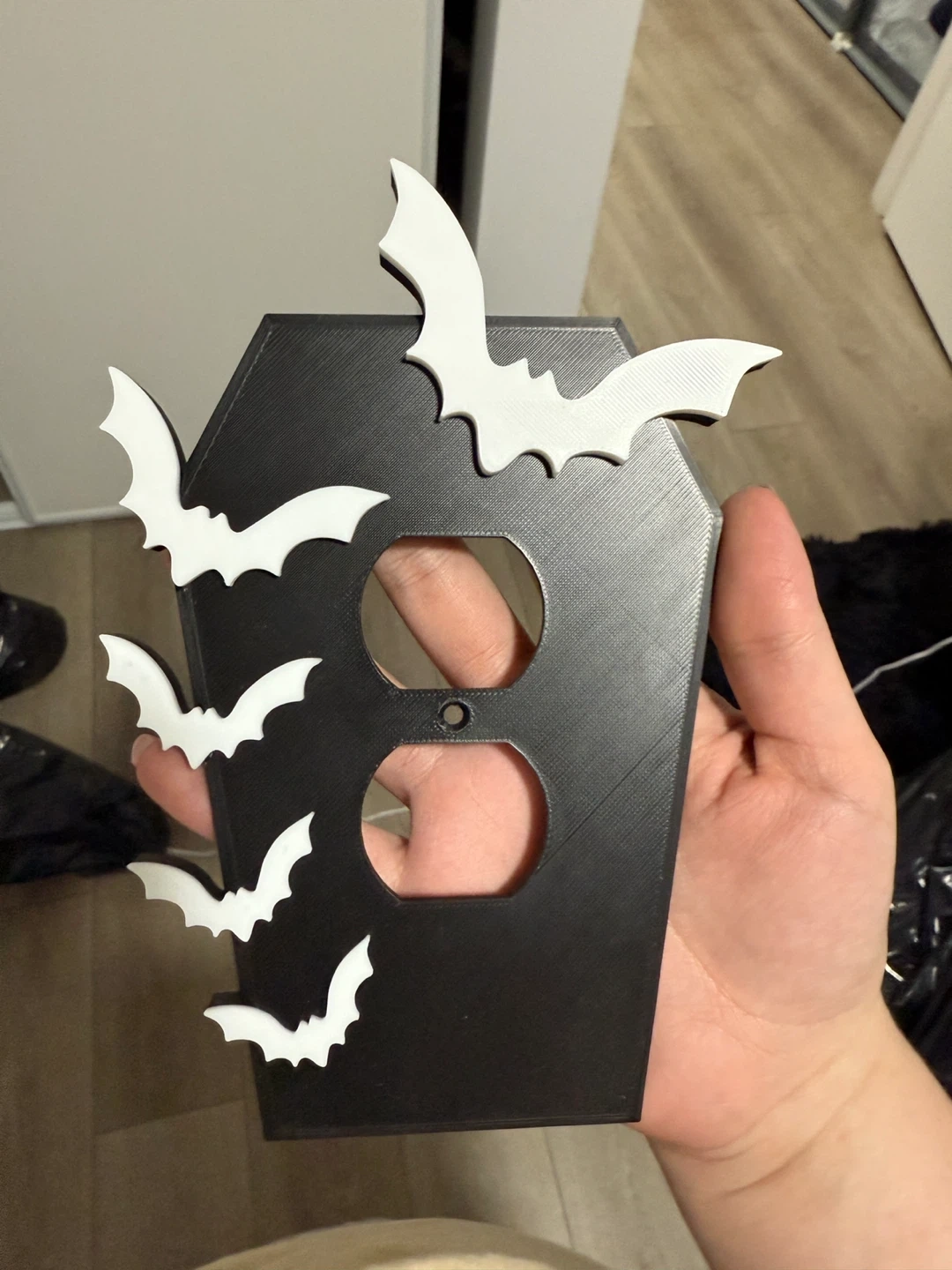Add a spooky touch to your home with this coffin-shaped outlet cover! It features cute little bats and is perfect for Halloween decor. It's in great condition and ready to add some fun to your space
