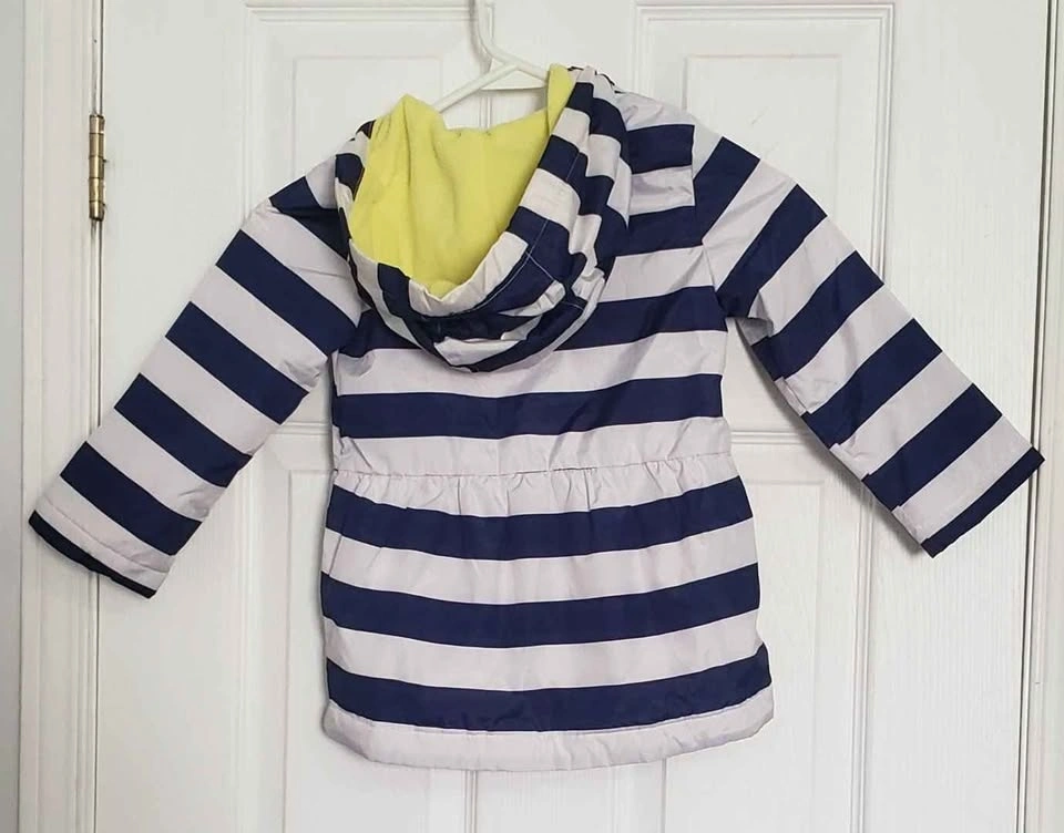 Toddler girls Carters striped spring rain coat jacket. Hooded and fleece lined. Size 4T. Minor stain on left shoulder. Cash only. If listing is up, it's available.