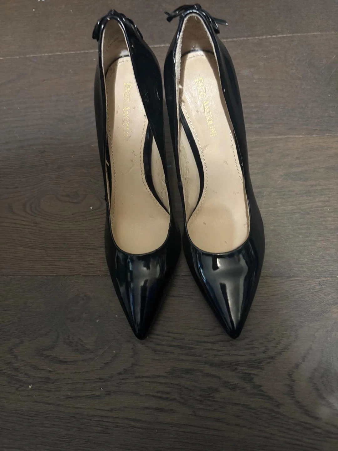 Enzo Angiolini black patent leather stiletto heels. Size 8.5M. These pumps feature a classic pointed toe and a sleek finish. They're a stylish choice for dressing up any outfit!