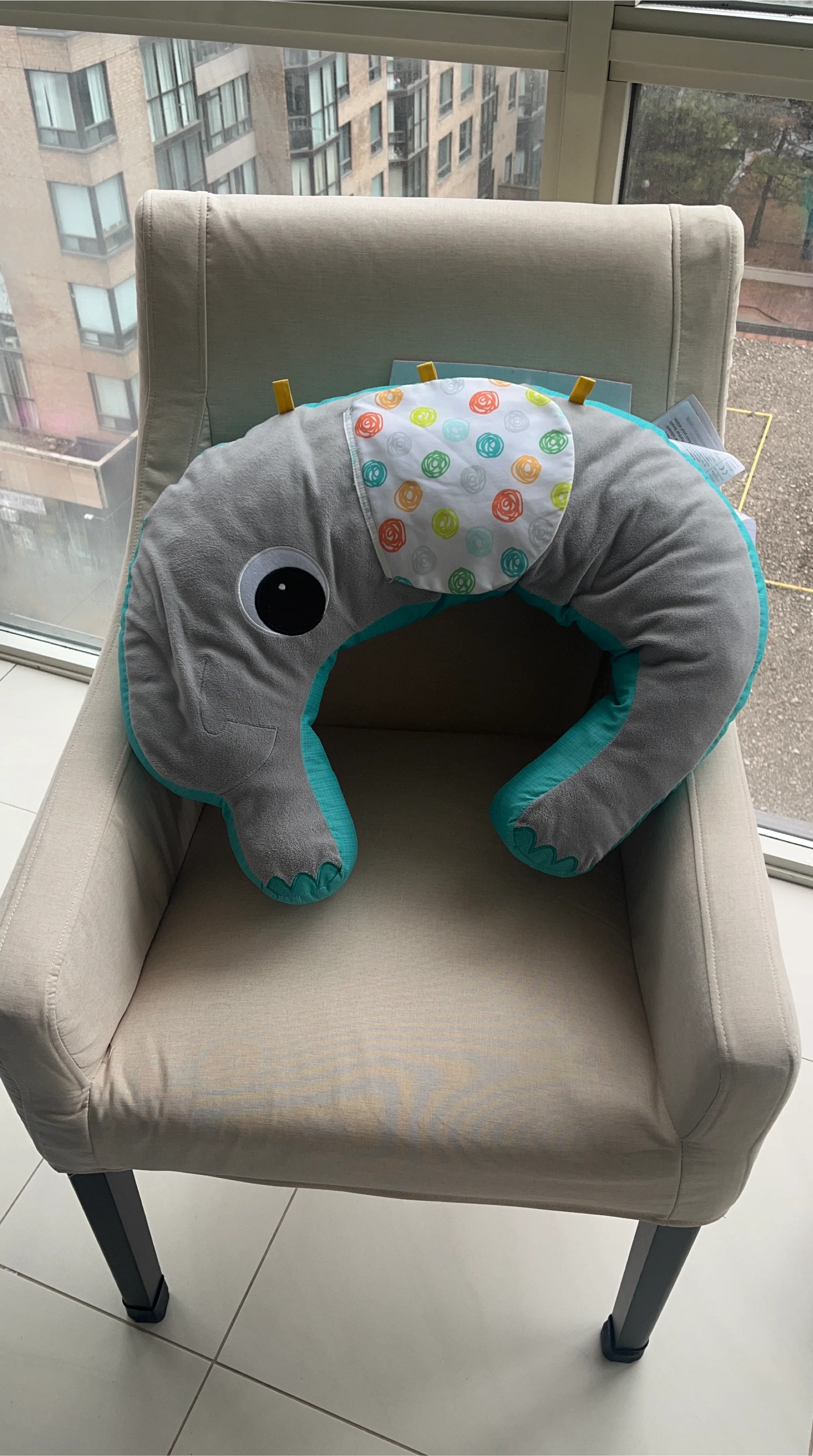 Soft grey nursing pillow with teal accents. It has a cute elephant face design and a white centre with colourful circles. Perfect for supporting during feeding times or for tummy time.