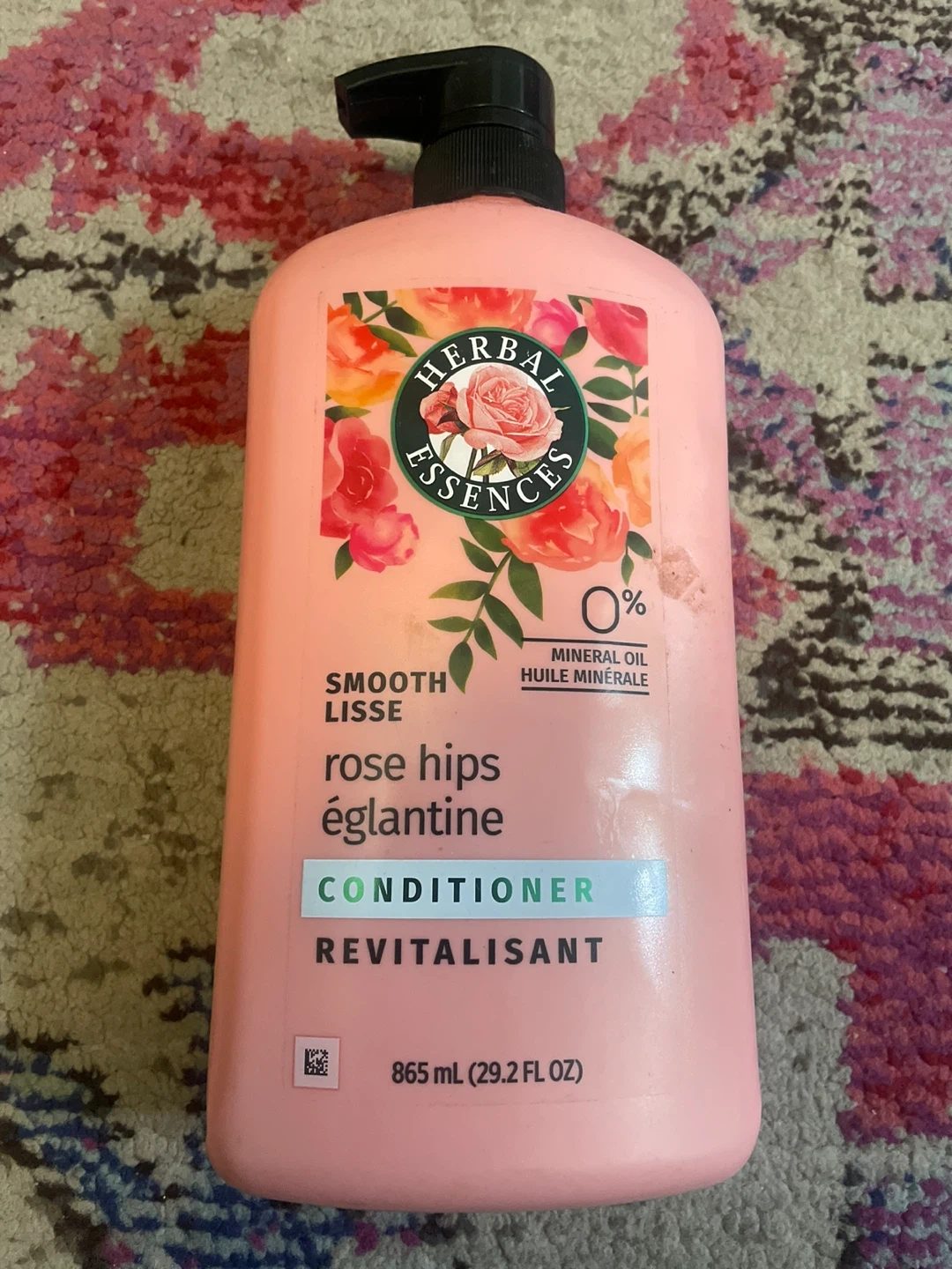 Herbal Essences Smooth conditioner with rose hips and jojoba extract. Infused blend of rose hips, vitamin E, and jojoba extract. It's pH balanced and color safe. 865 ml (29.2 fl oz) bottle.