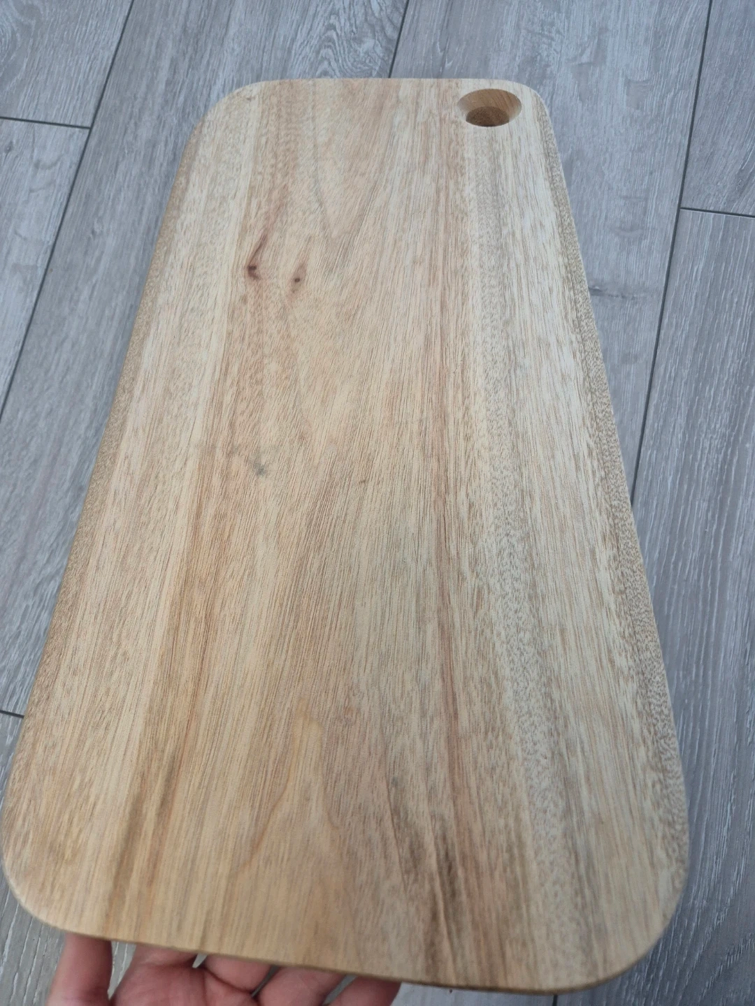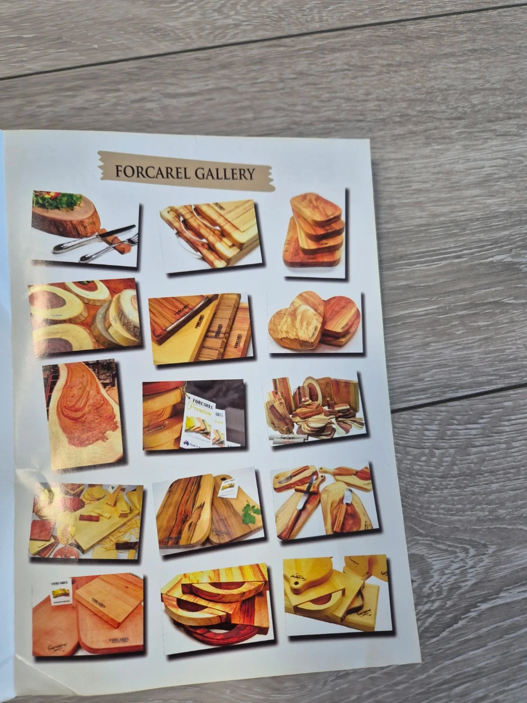 Wooden cutting board by Forcarel. It's made from natural wood and has a hole for hanging. This board is great for everyday food prep!