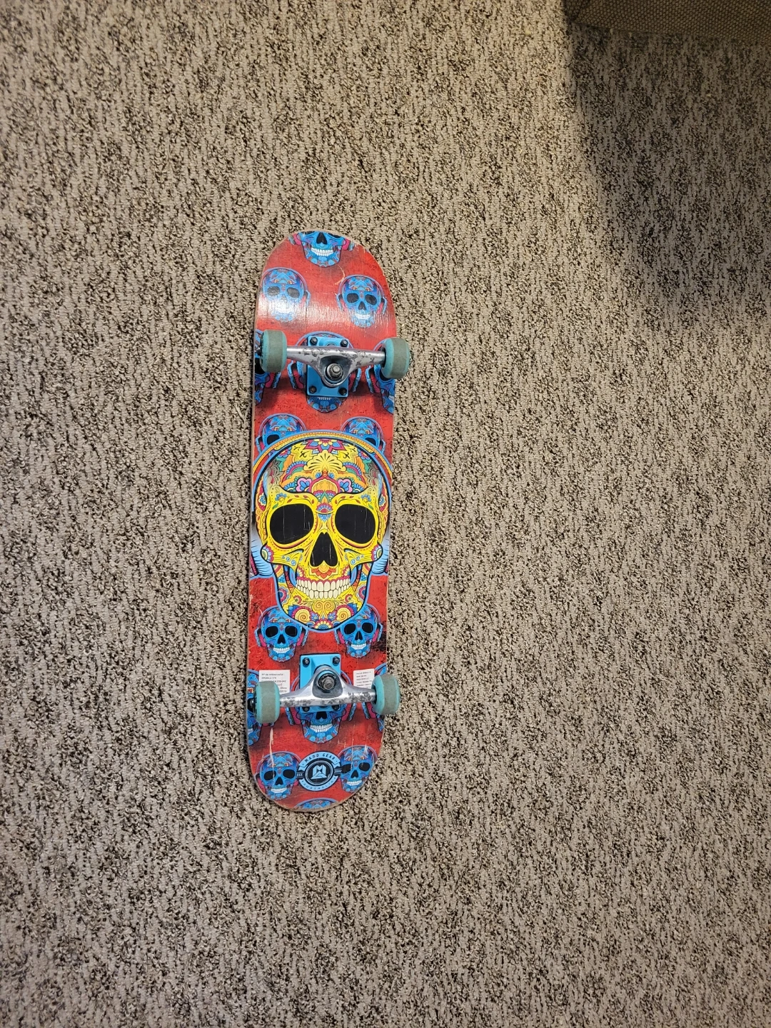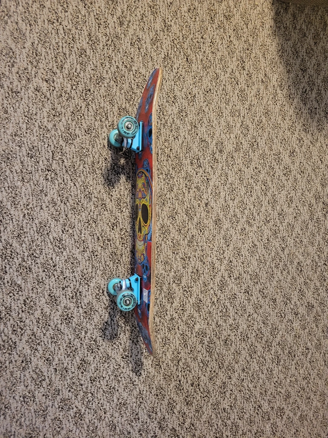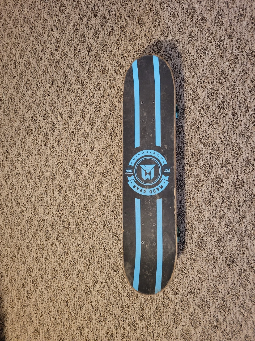 This is a Madd Gear skateboard with a cool skull graphic on one side and blue stripes on the other. It's ready for cruising or tricks! Wood deck, metal trucks, and blue wheels.