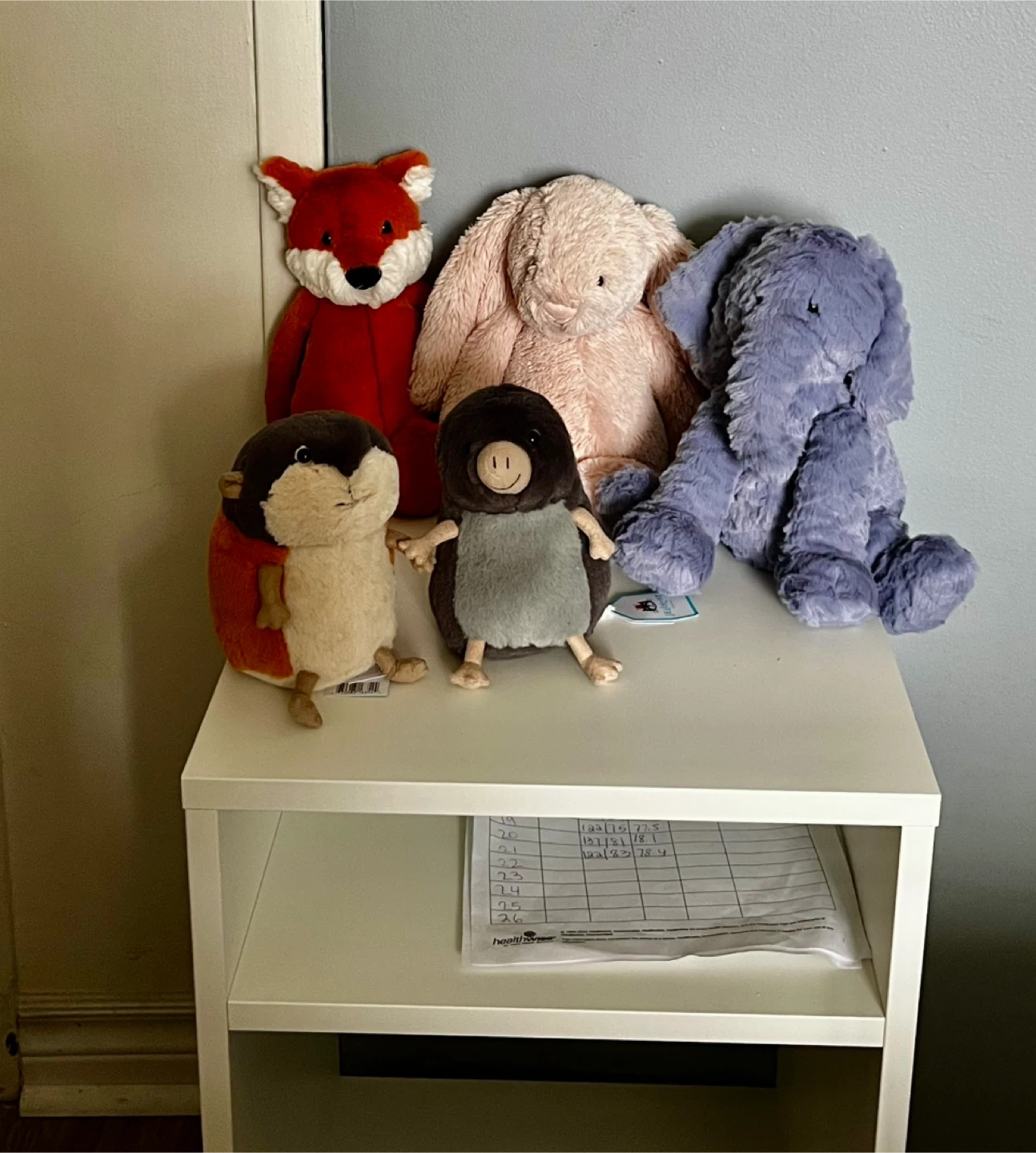 This is a set of four Jellycat plush toys, including a red fox, a pink bunny, a purple elephant, and a brown and cream hedgehog. They're soft and cuddly! These plush toys are great for play or decoration.