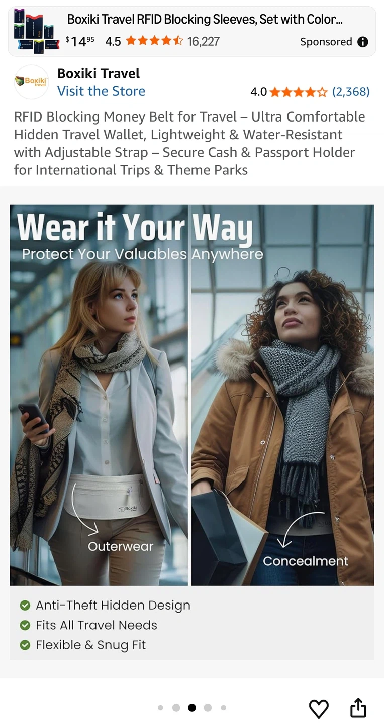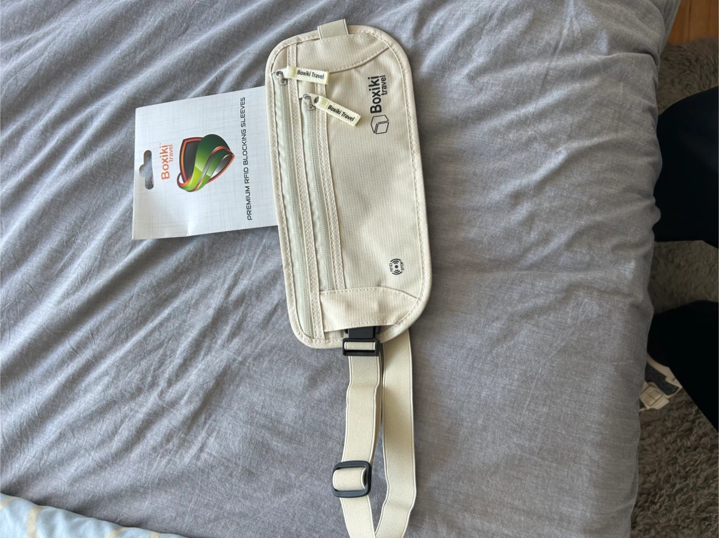 This new unused Boxiki Travel money belt is beige and features RFID blocking fabric. It has multiple secure pockets and adjustable straps with heavy-duty zippers and buckle. Reinforced stitching ensures durability. Secure your valuables on trips and theme parks!