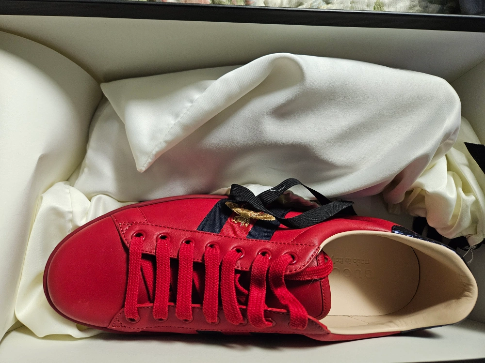 Red leather low-top sneakers from Gucci with the signature bee embroidery. Includes the original box and dust bag. These sneakers are a classic choice for a stylish look.