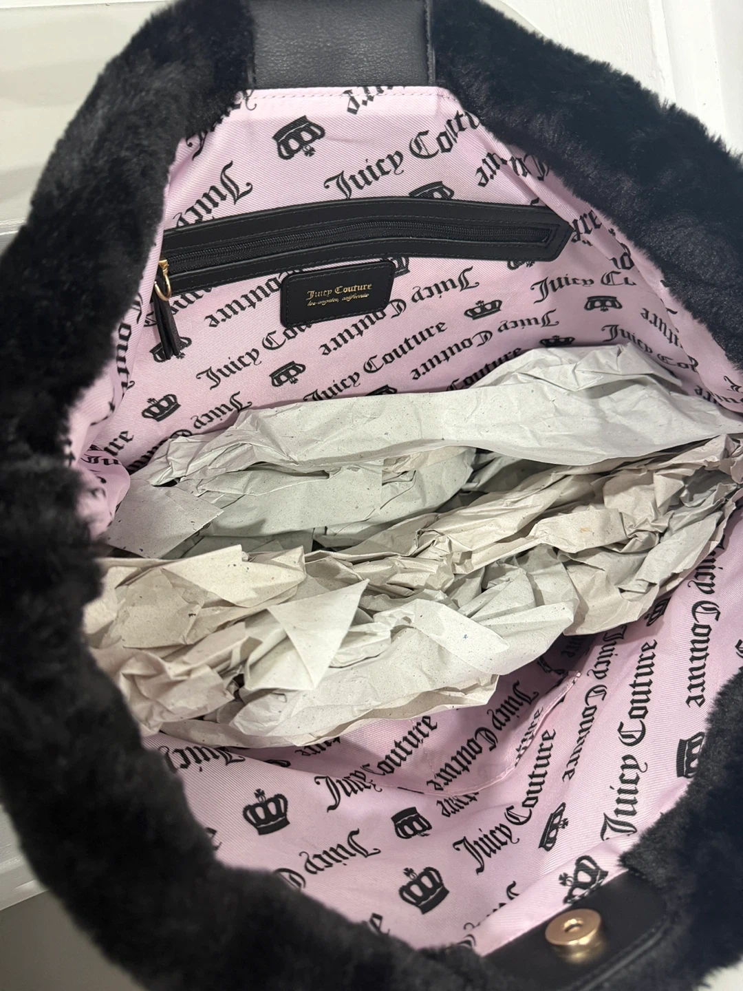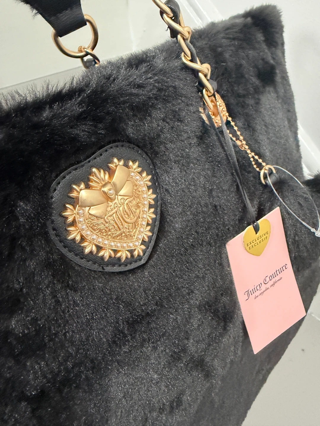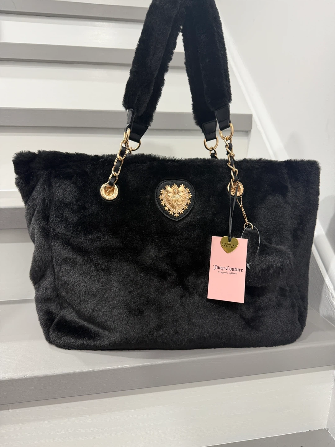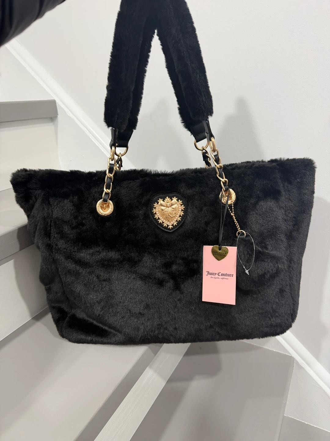 This Juicy Couture tote is brand new with tags! It's a super cute black faux fur bag with gold chain detailing and a heart emblem. The interior lining is pink with the Juicy Couture logo printed throughout. Perfect for adding a touch of glam to your everyday look