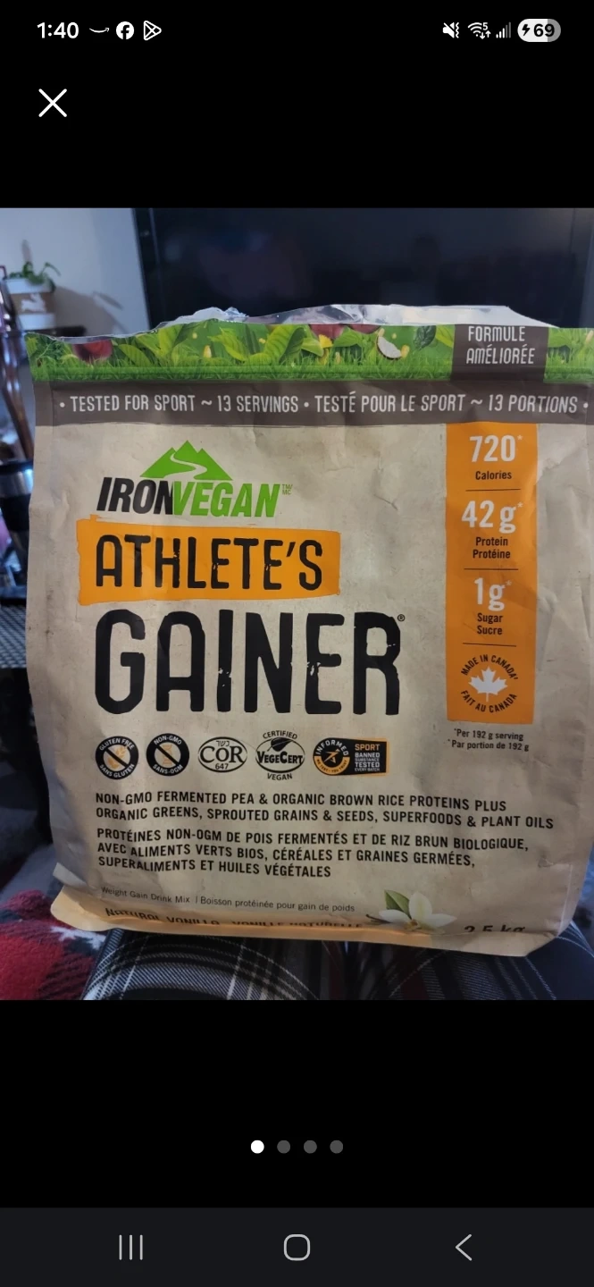 This is Iron Vegan Athlete's Gainer weight gain drink mix. It's made with organic non-GMO pea and brown rice proteins, sprouts, seeds, superfoods, and plant oils. Expiry date is May 2026.