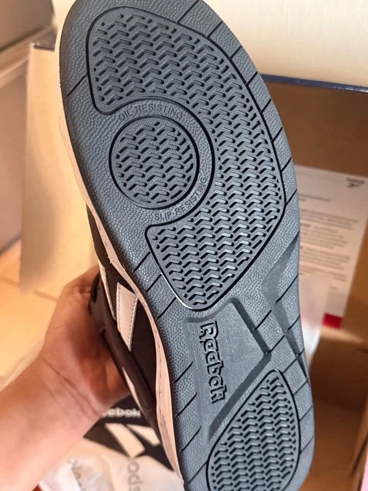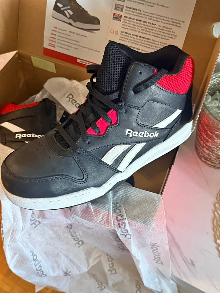 Protective Reebok BB4500 Work high top sneakers in black and red. Features composite toe, electrical shock resistance, puncture protection, slip resistance, and a metal-free design. Comes in original box. Pickup at Kipling and Steels.