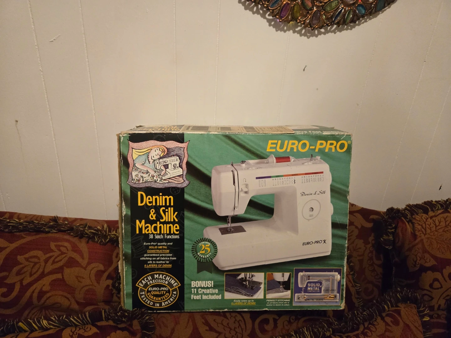 Selling a EURO-PRO Denim & Silk Machine! This sewing machine has 38 stitch functions and is designed for solid metal construction. It can handle various fabrics, from silk to leather, and up to 8 layers of denim. Also includes 11 creative feet!
