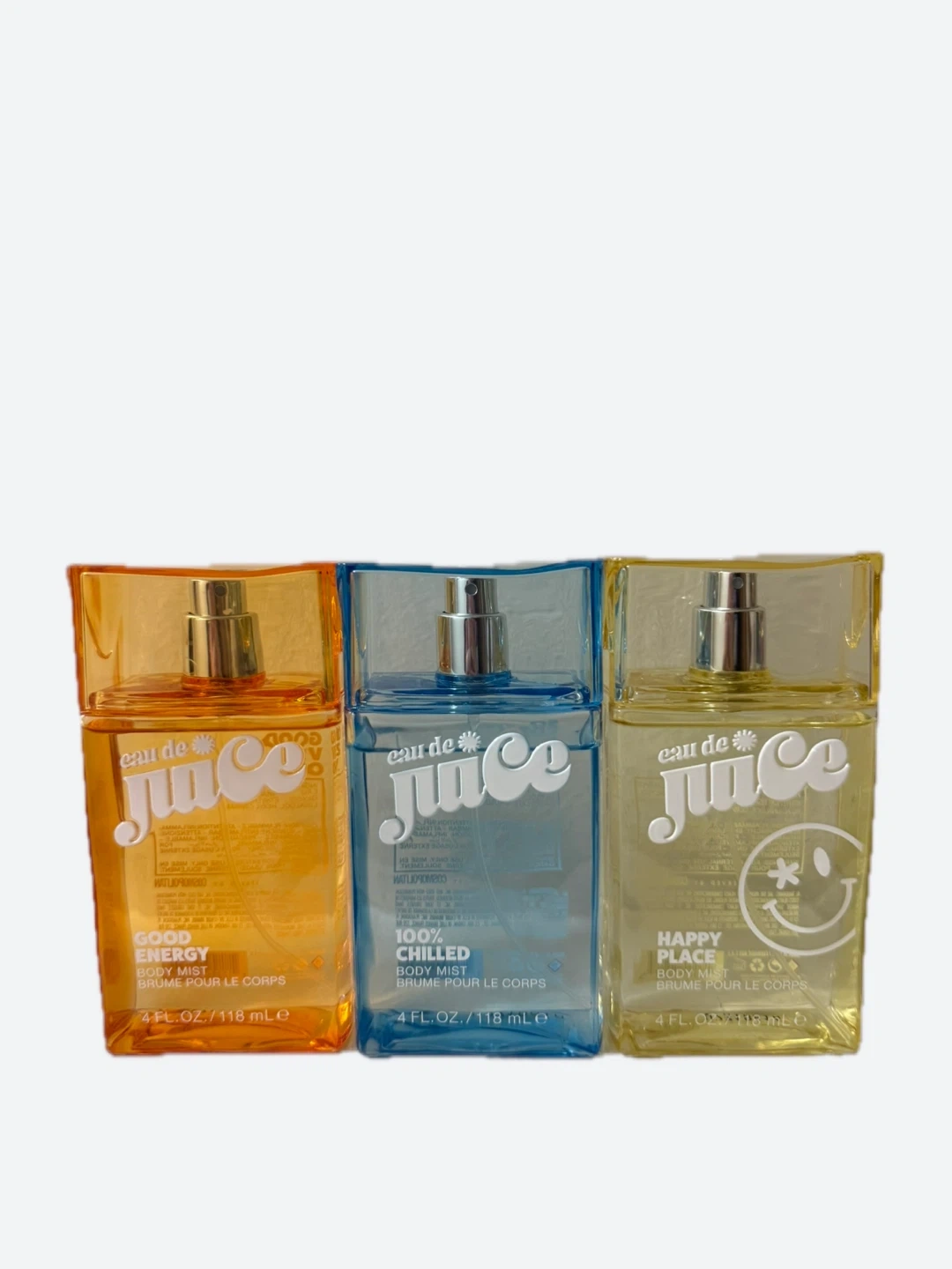 This set includes three Eau de Juice body mists: Good Energy, 100 Chilled, and Happy Place. Each bottle contains approximately 4 FL. OZ. / 118 mL. Slightly used.