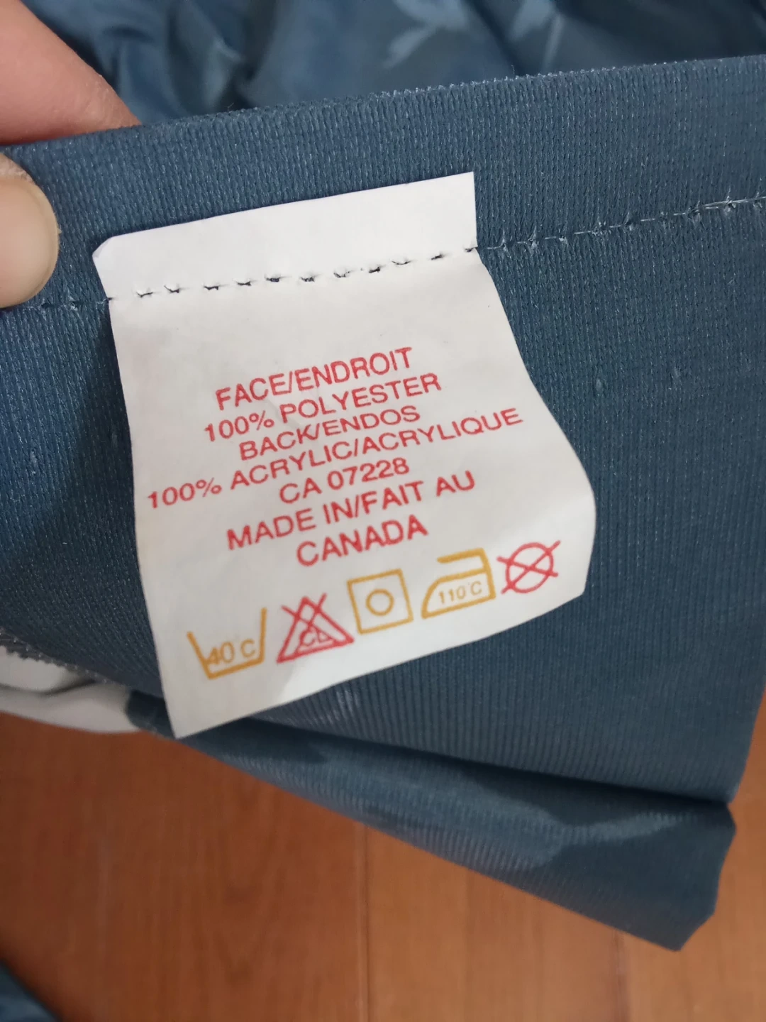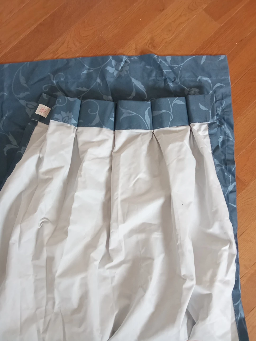Two curtains with a blue floral pattern. Face is 100% polyester and the back is 100% acrylic. Made in Canada.