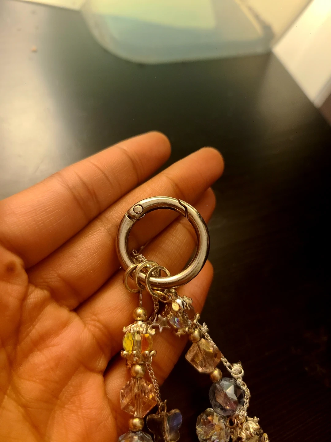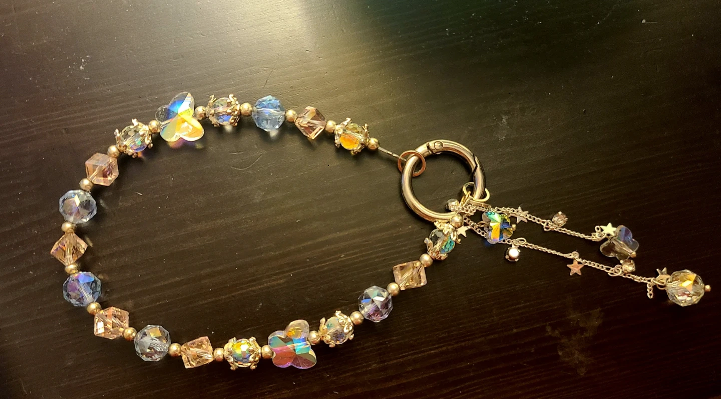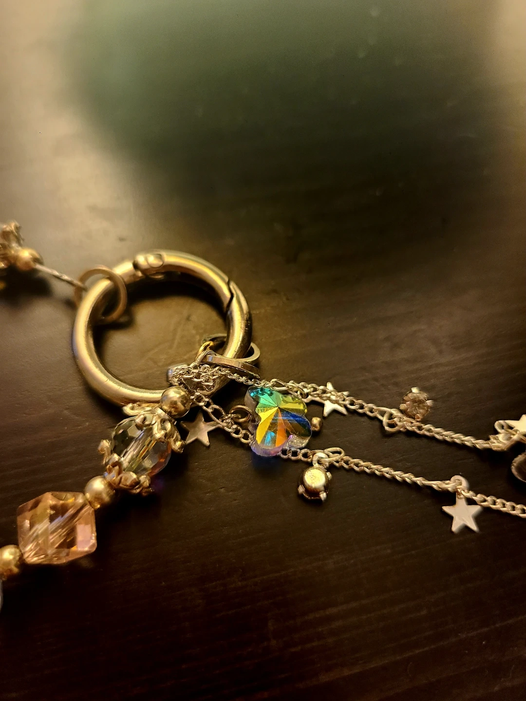 This sparkly keychain features a colourful butterfly charm and assorted crystal beads. It also has dangling chains with star charms. It's great for adding some flair to your keys, phone, or bag!