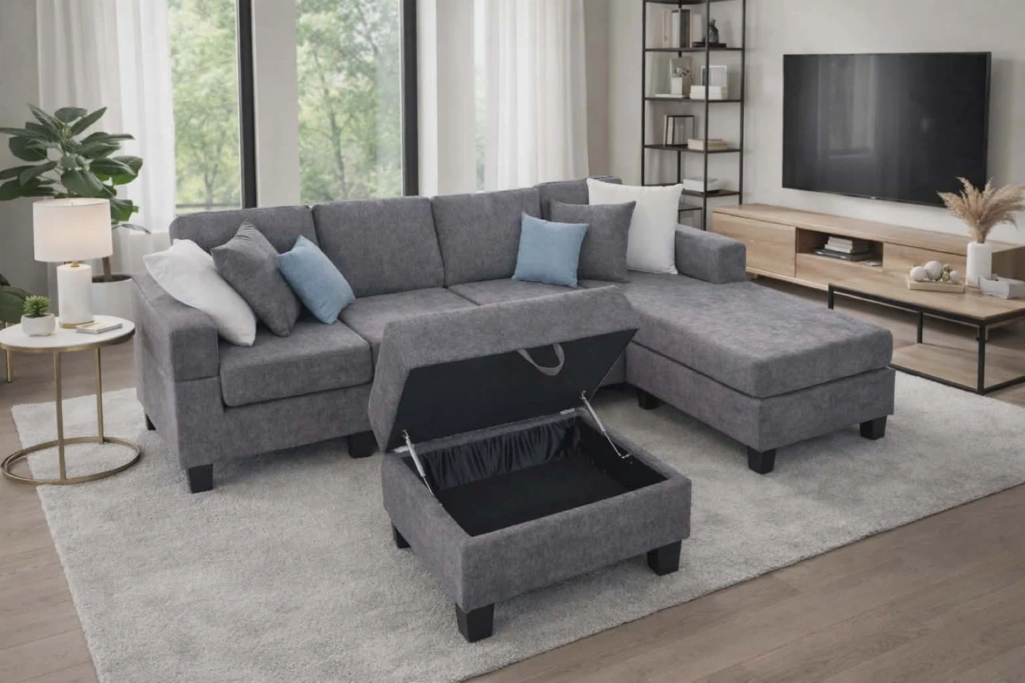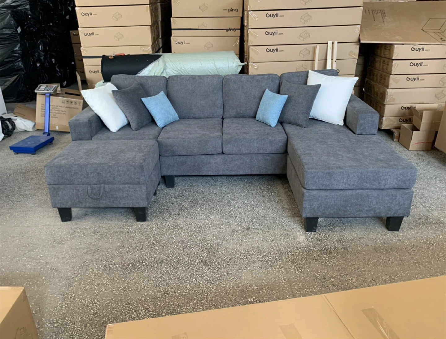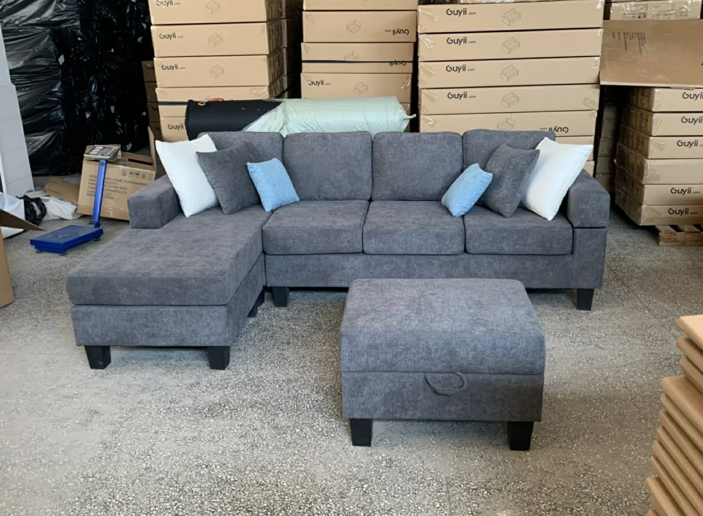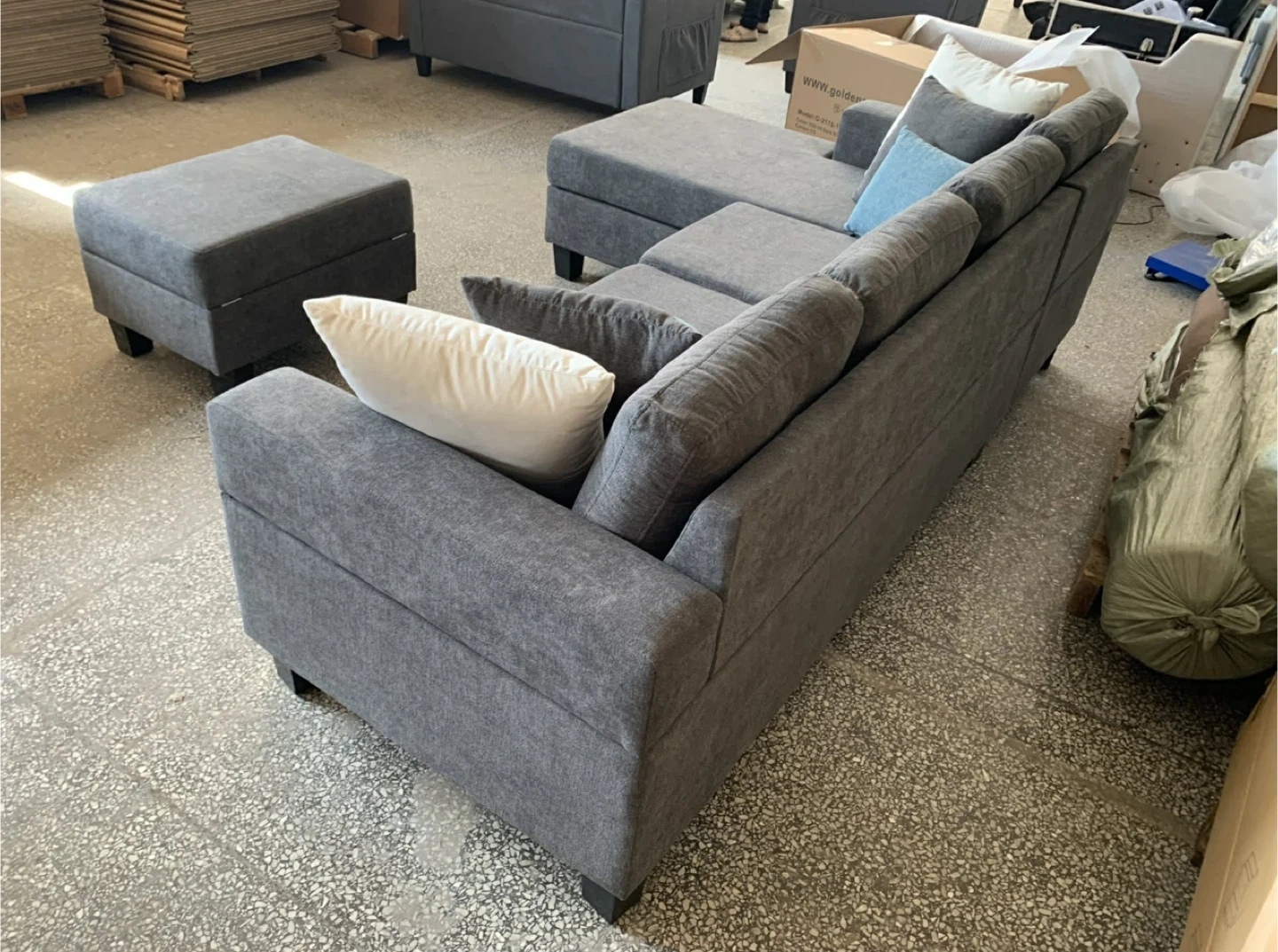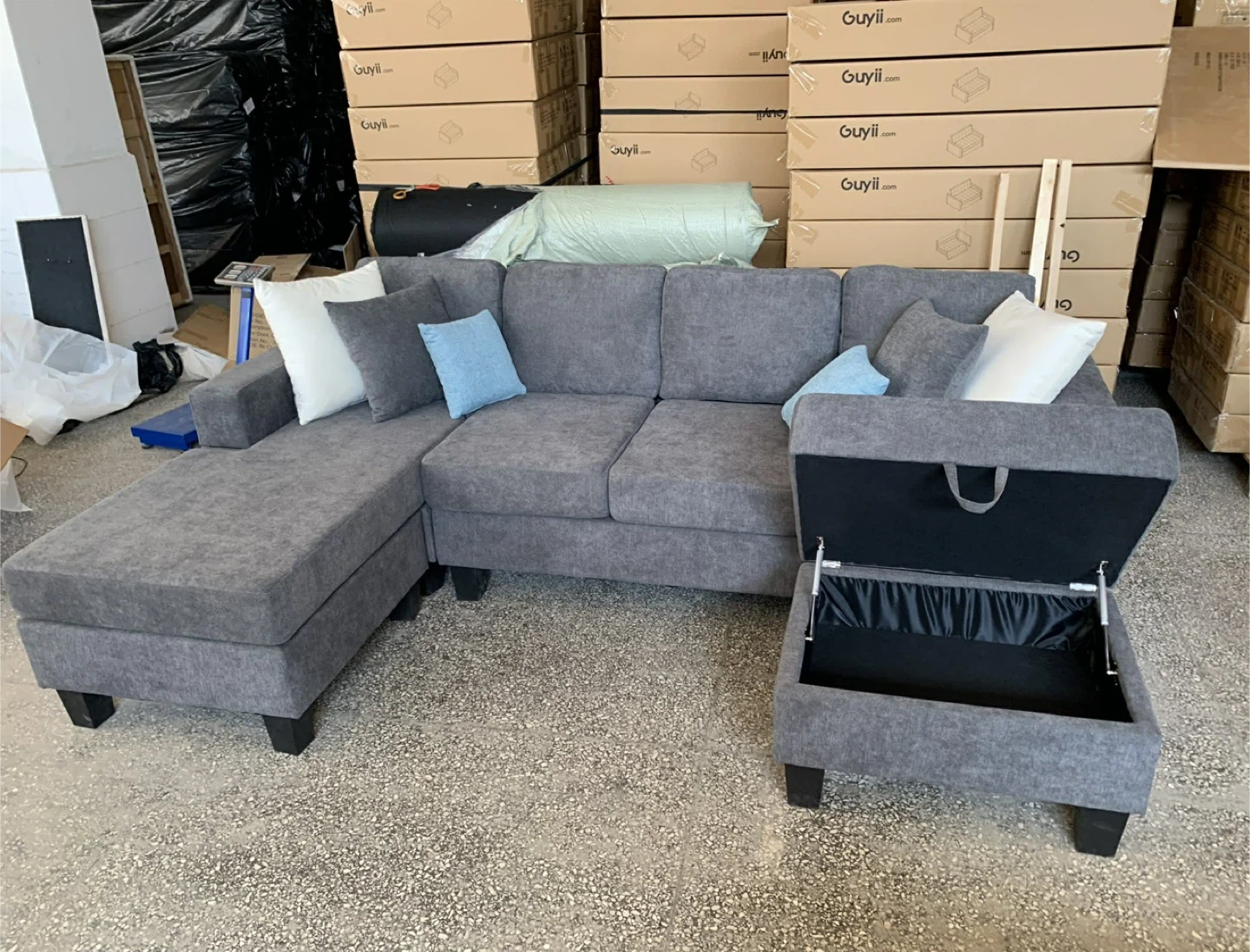The sofa set comes with a matching generously sized storage ottoman that is cushioned to add an aditional seat or foot lounge. It opens easily with hydraulic arms for easy access. The Sofa set also comes with 6 soft accent throw pillows.