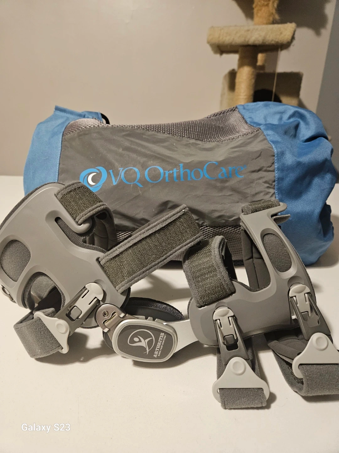 VQ OrthoCare knee brace for arthritis pain. Includes a blue and gray carrying bag. Adjustable straps for a secure fit. Comes with both right and left knee braces and carry bags.