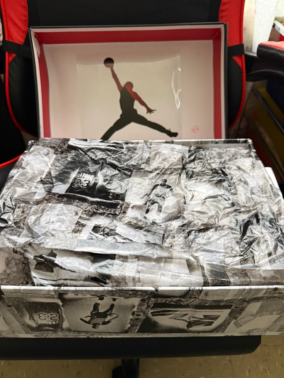 Iconic Jordan 4 "White Cement" sneakers are ready for a new home. They feature a white leather upper with black and red accents. Includes the original box and packing paper.