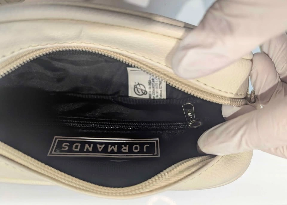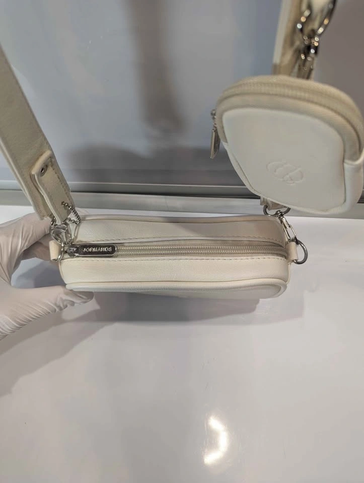 Elevate your streetwear game with this iconic Jormands Crossbody, a staple of modern Colombian design. Known for its distinct "utility" aesthetic and high-performance materials, this bag is the perfect blend of style and practicality for daily use or travel. Crafted from 100% Colombian PVC Vegan Leather—highly durable, waterproof, and effortless to clean. Features the classic "Bone" (off-white) colorway with embossed Jormands branding and custom metallic hardware. Includes the signature detachable circular coin purse on the adjustable strap, perfect for keys, AirPods, or small essentials. Fully lined with a waterproof interior to keep your belongings safe in any weather. Retails online for approximately $105.00 CAD. In "Fair to Good" pre-owned condition. This bag and attachable card holder and strap has some slight blueing on one side of the bag from rubbing against denim.