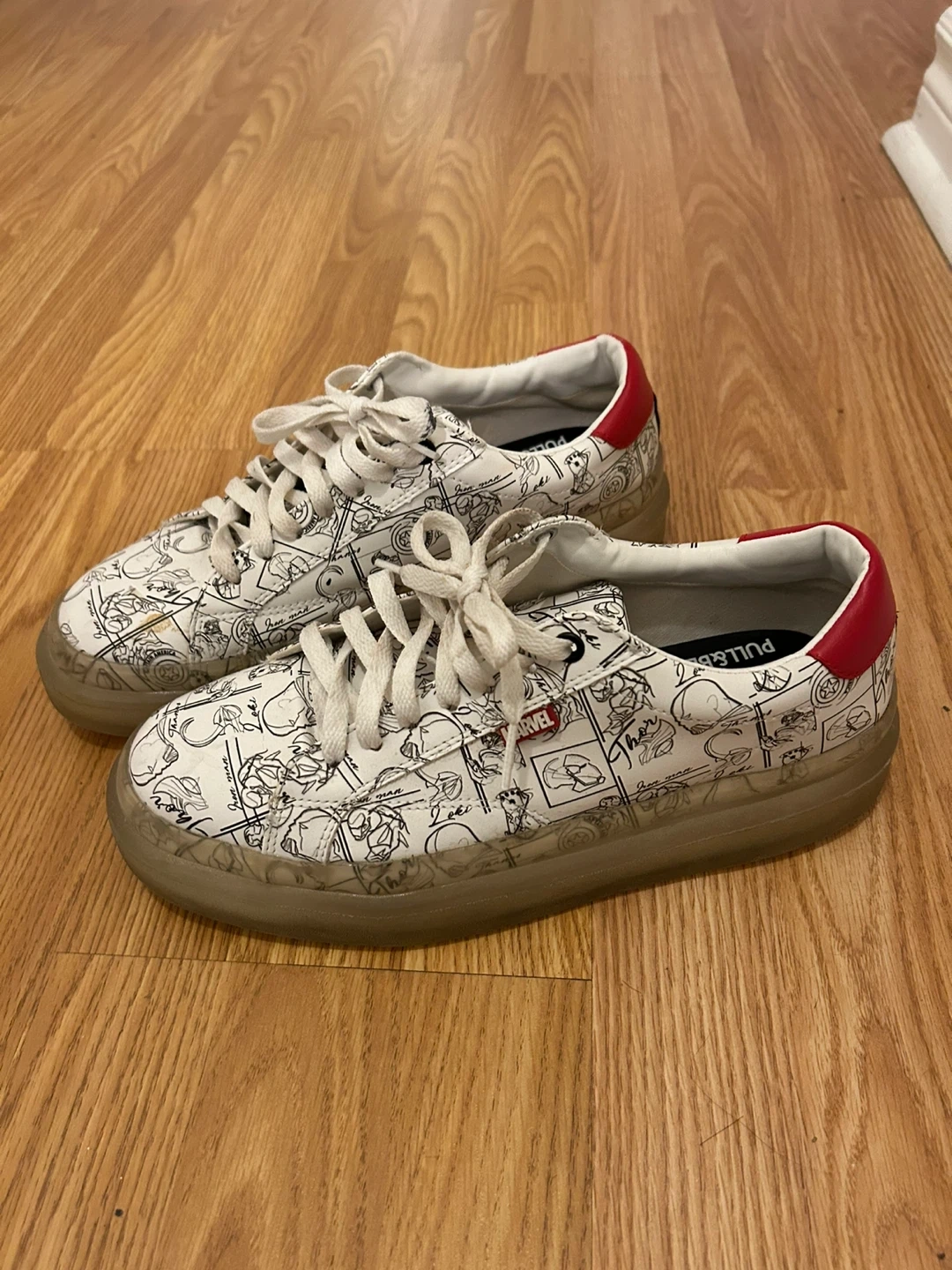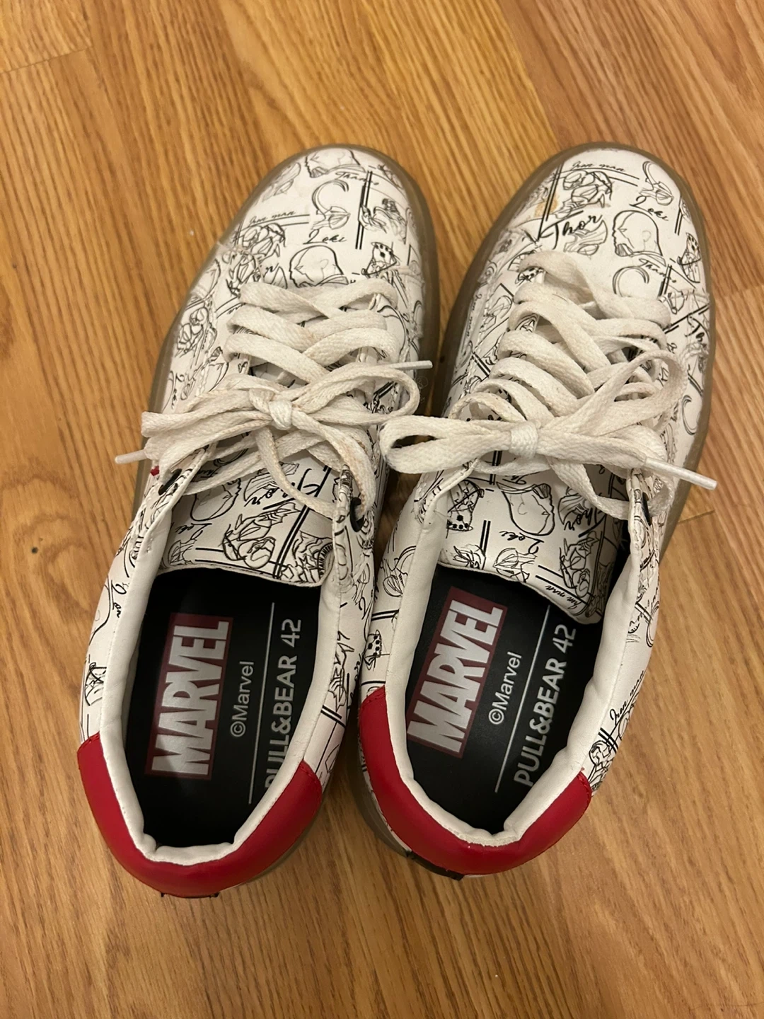 Selling a pair of Pull&Bear Marvel sneakers in size 9. They feature a unique Marvel comic design on a white base with red accents. The soles are a light gum colour. They're in great shape and ready for a new home!