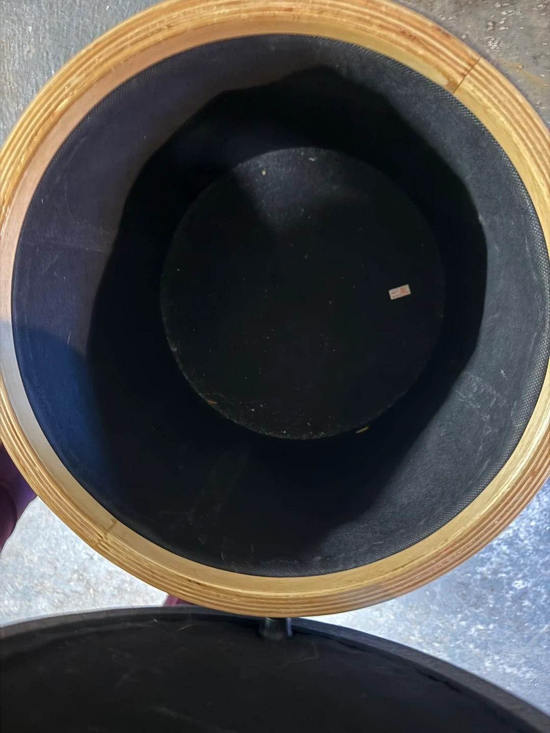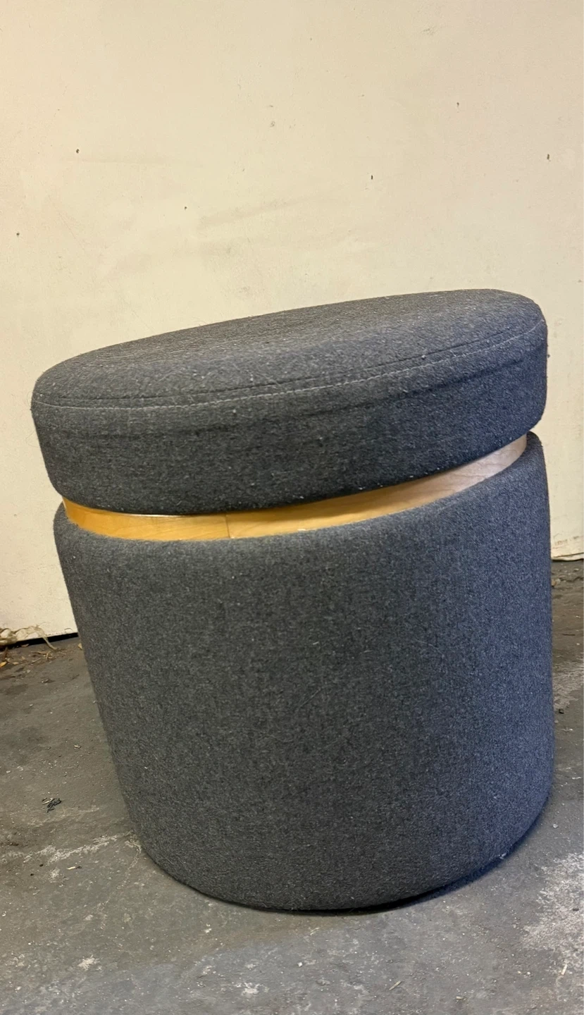This round storage ottoman is upholstered in dark gray fabric. It features a lift-off lid for hidden storage inside. The wood frame adds a nice contrast. Perfect for a living room or bedroom!