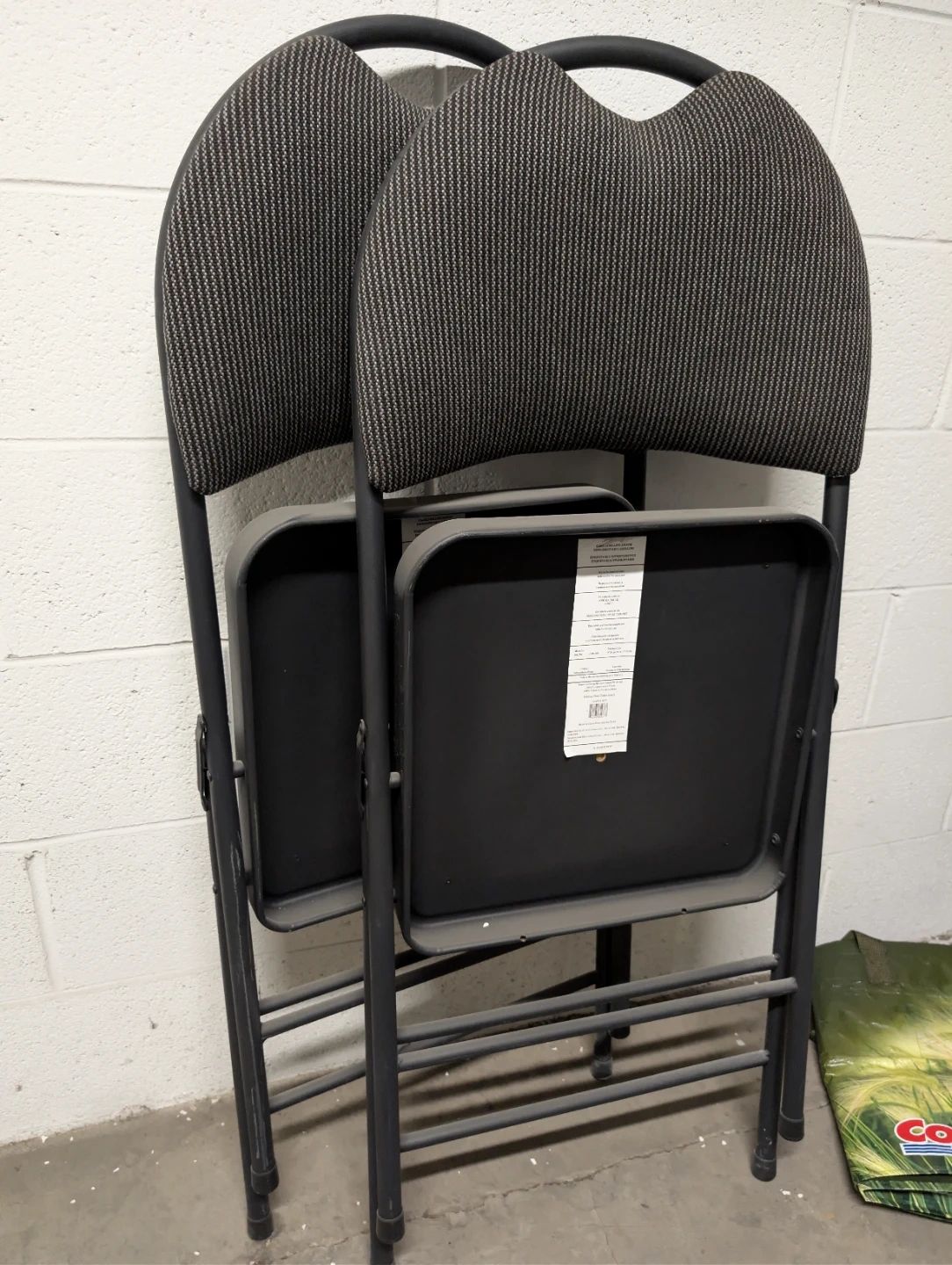 They feature a grey fabric seat and back with a black metal frame. These chairs are easy to fold and store. Great for extra seating at gatherings!