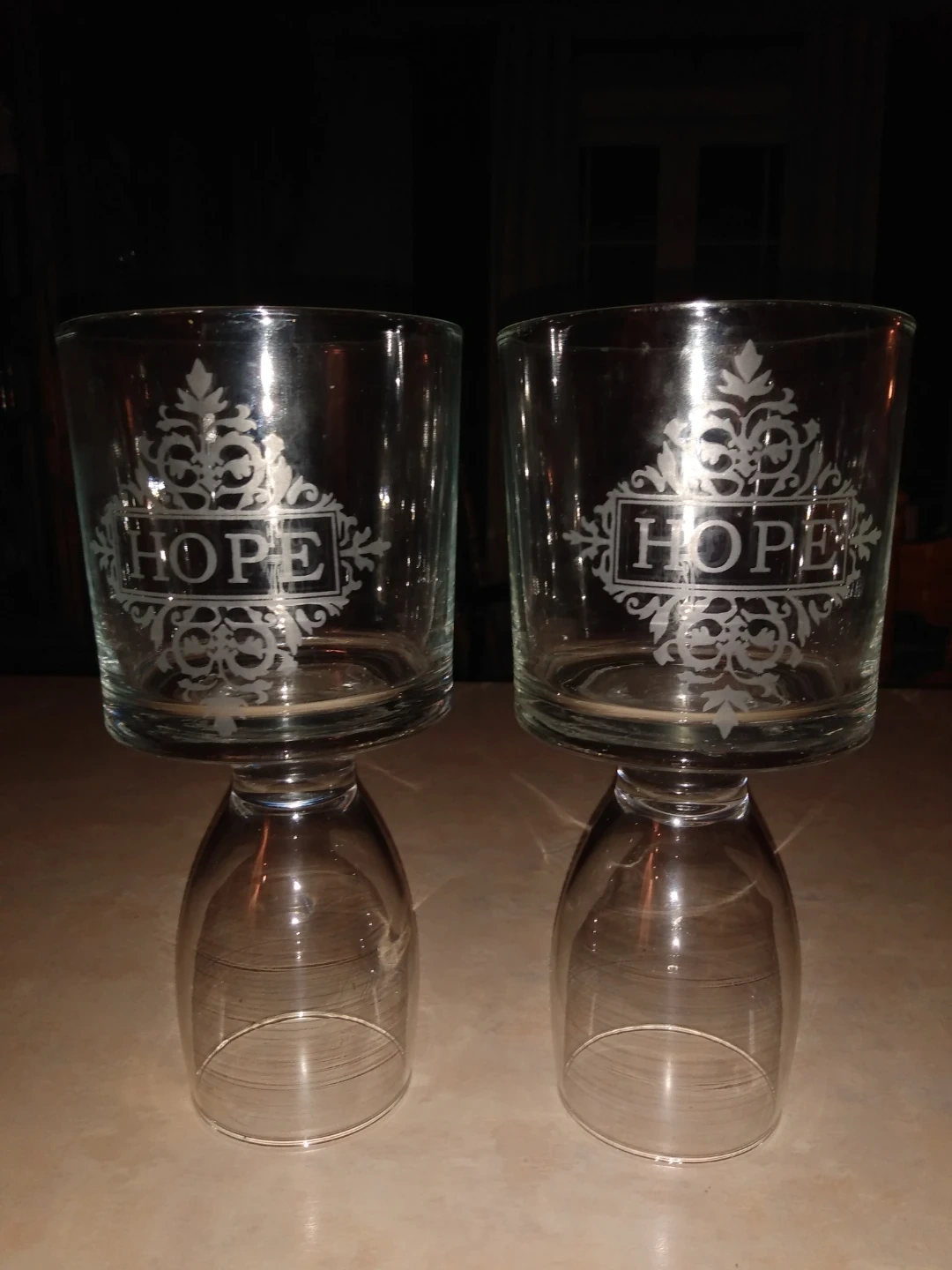 Two clear glass Candle holders featuring an etched "HOPE" design with decorative scrollwork. These glasses are sturdy and have a classic shape. Perfect for everyday use or special occasions!