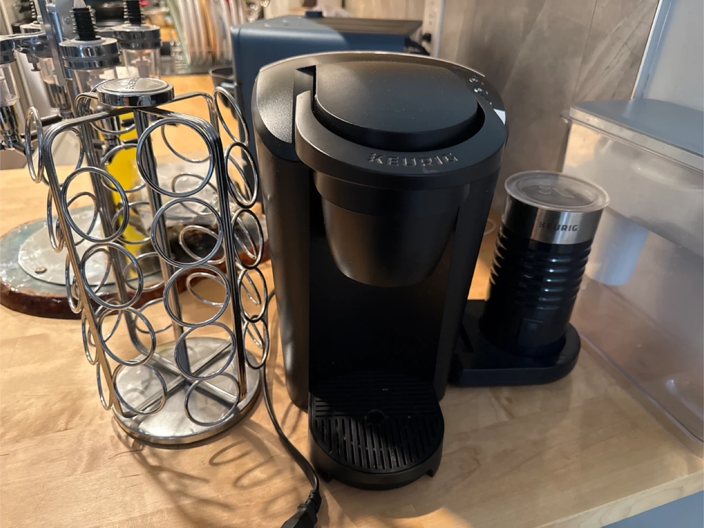 Black Keurig K-Mini coffee maker. Comes with a stainless steel K-Mini frother. This setup's great for making your favourite hot beverages at home. Perfect for a quick morning coffee or a frothy latte. Also has a k pod metal stand.
