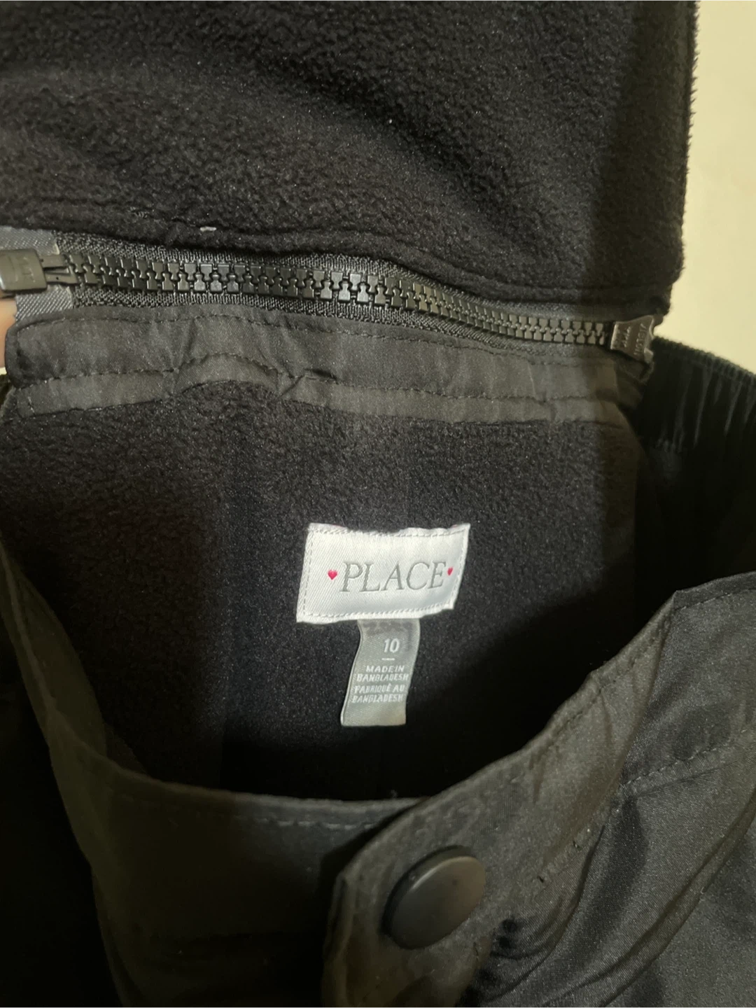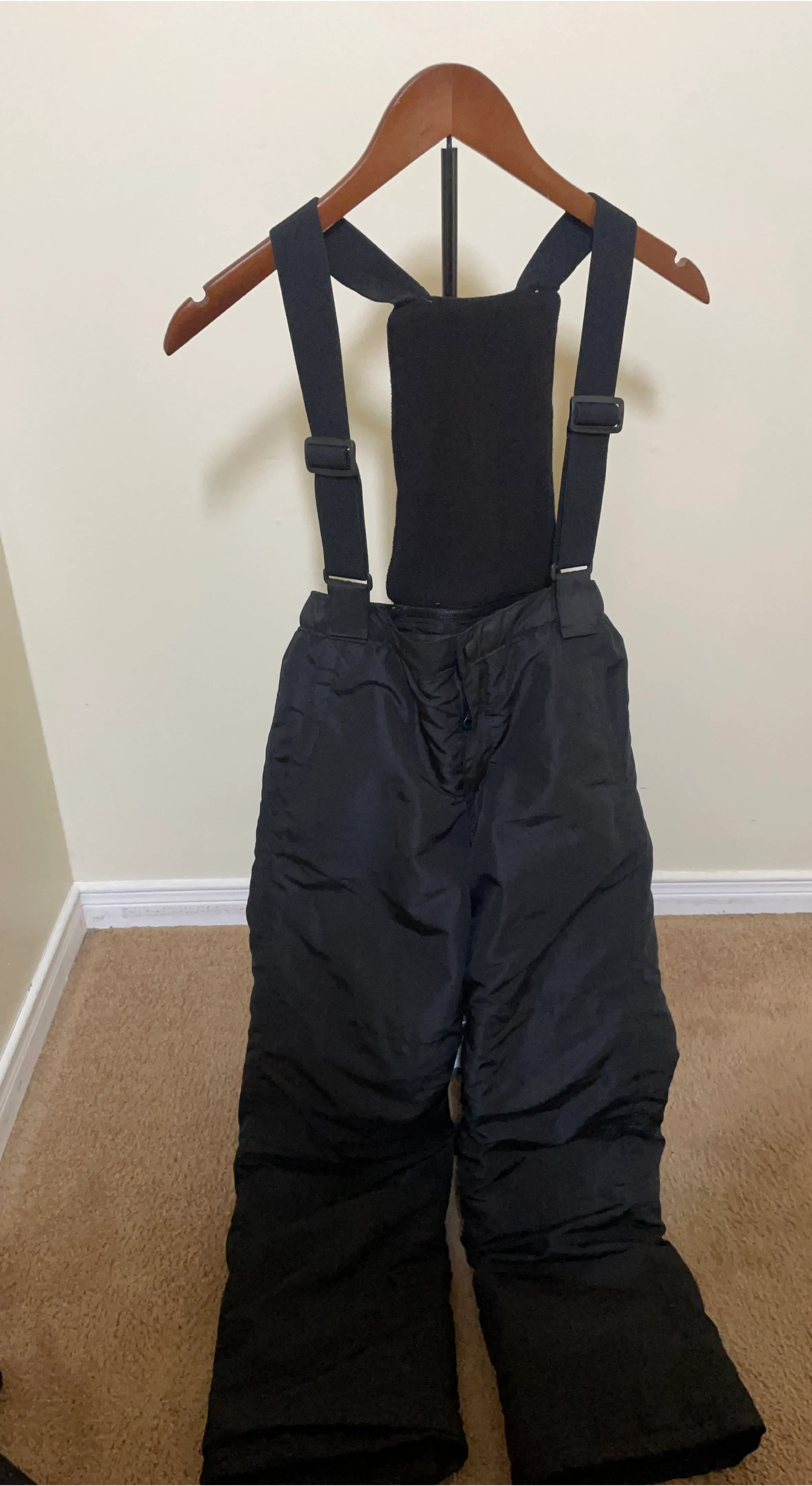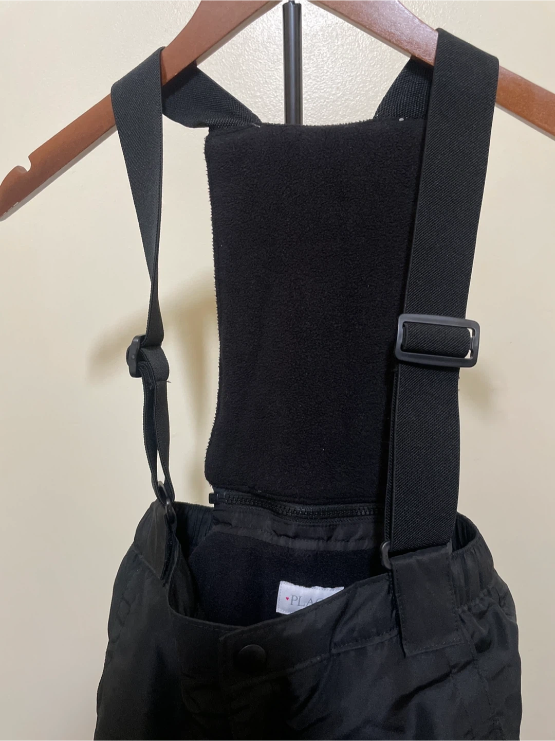 These black snow bib pants are from The Children's Place and are a size 10. They feature adjustable straps and a fleece-lined bib for warmth. Elasticized leg cuffs help keep snow out.