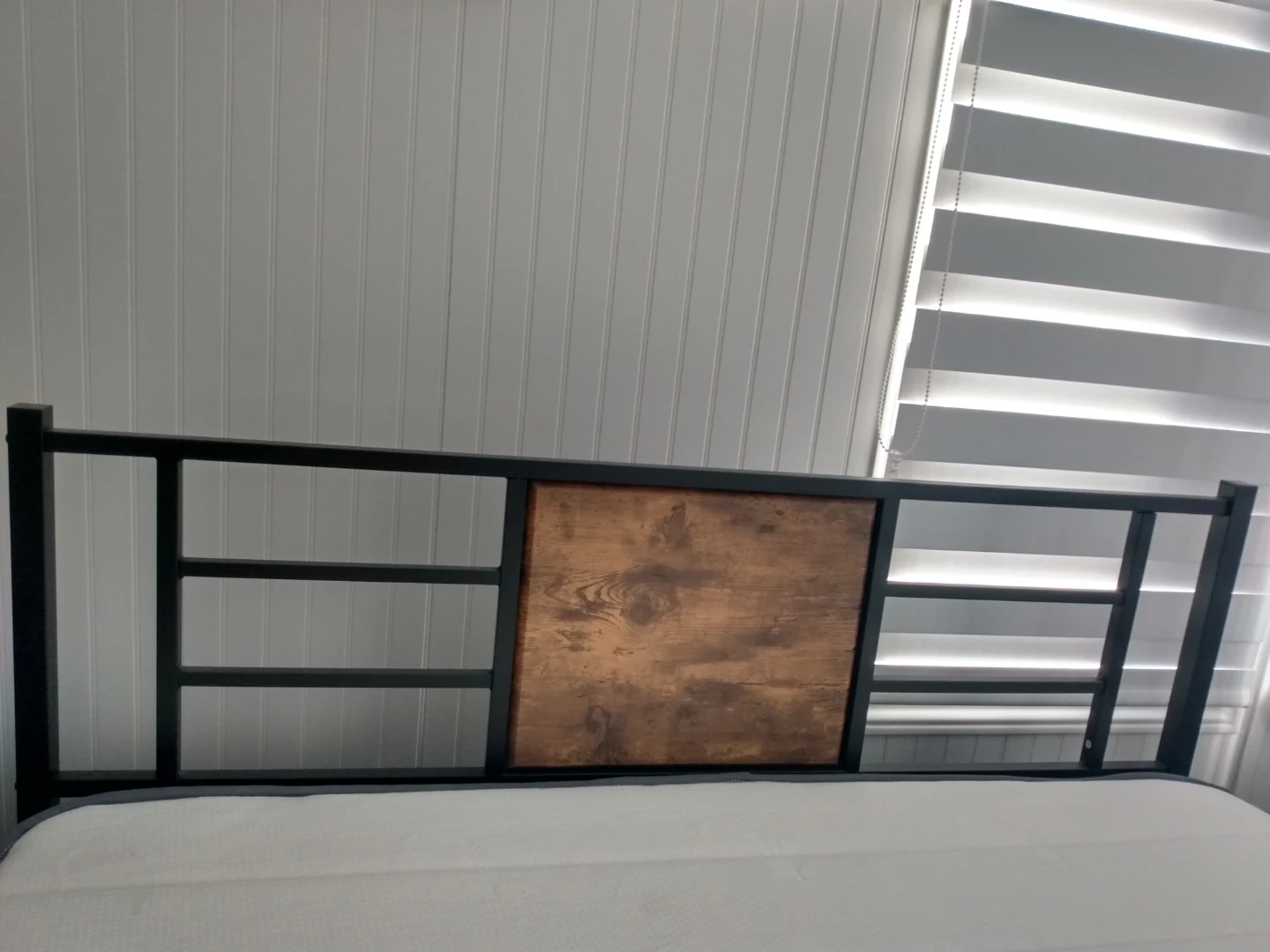 This is a black metal bed frame featuring a rustic wood accent in the headboard. It's a sturdy piece suitable for most standard mattress sizes. The industrial-style design makes it a stylish addition to any bedroom!