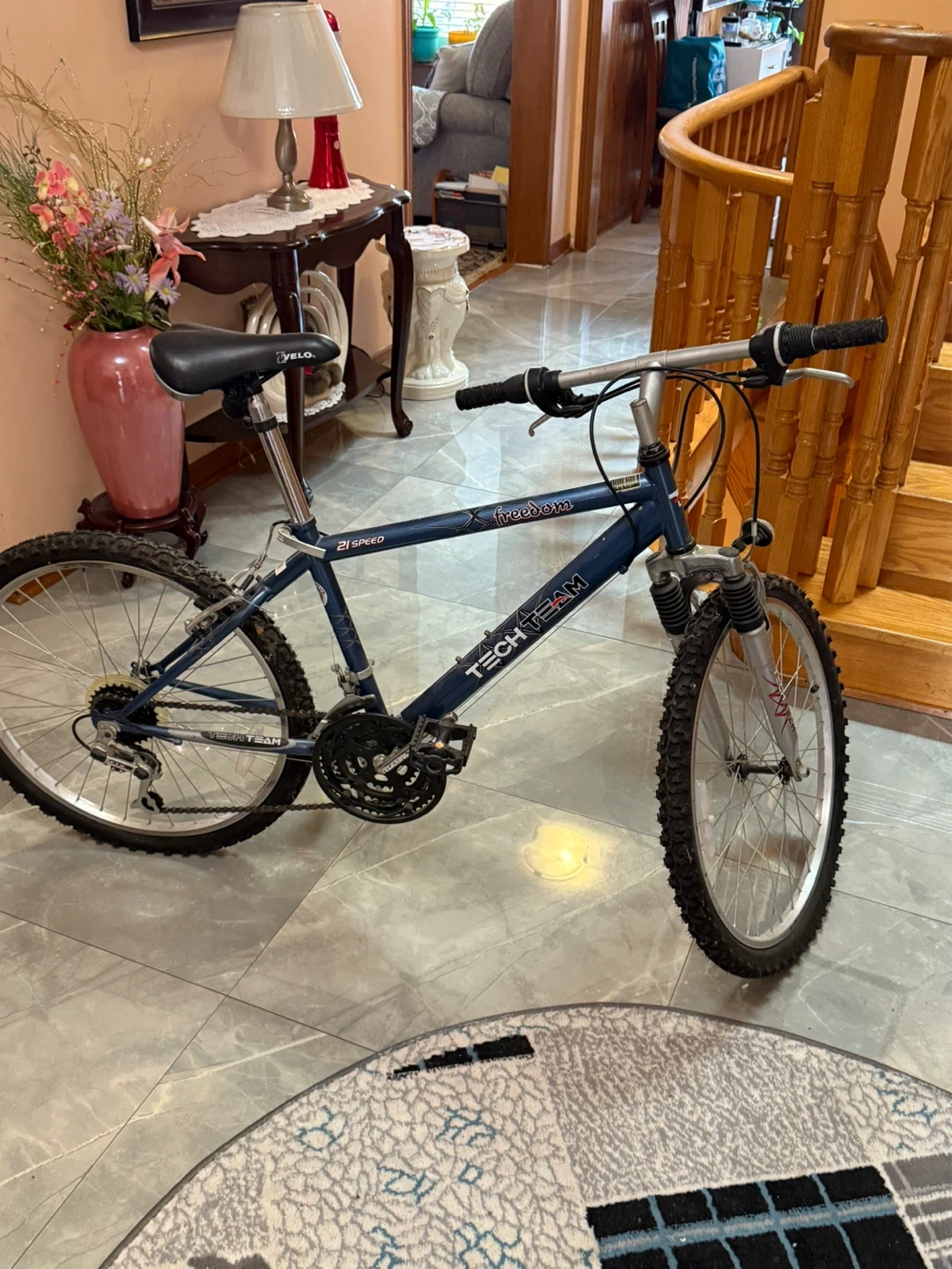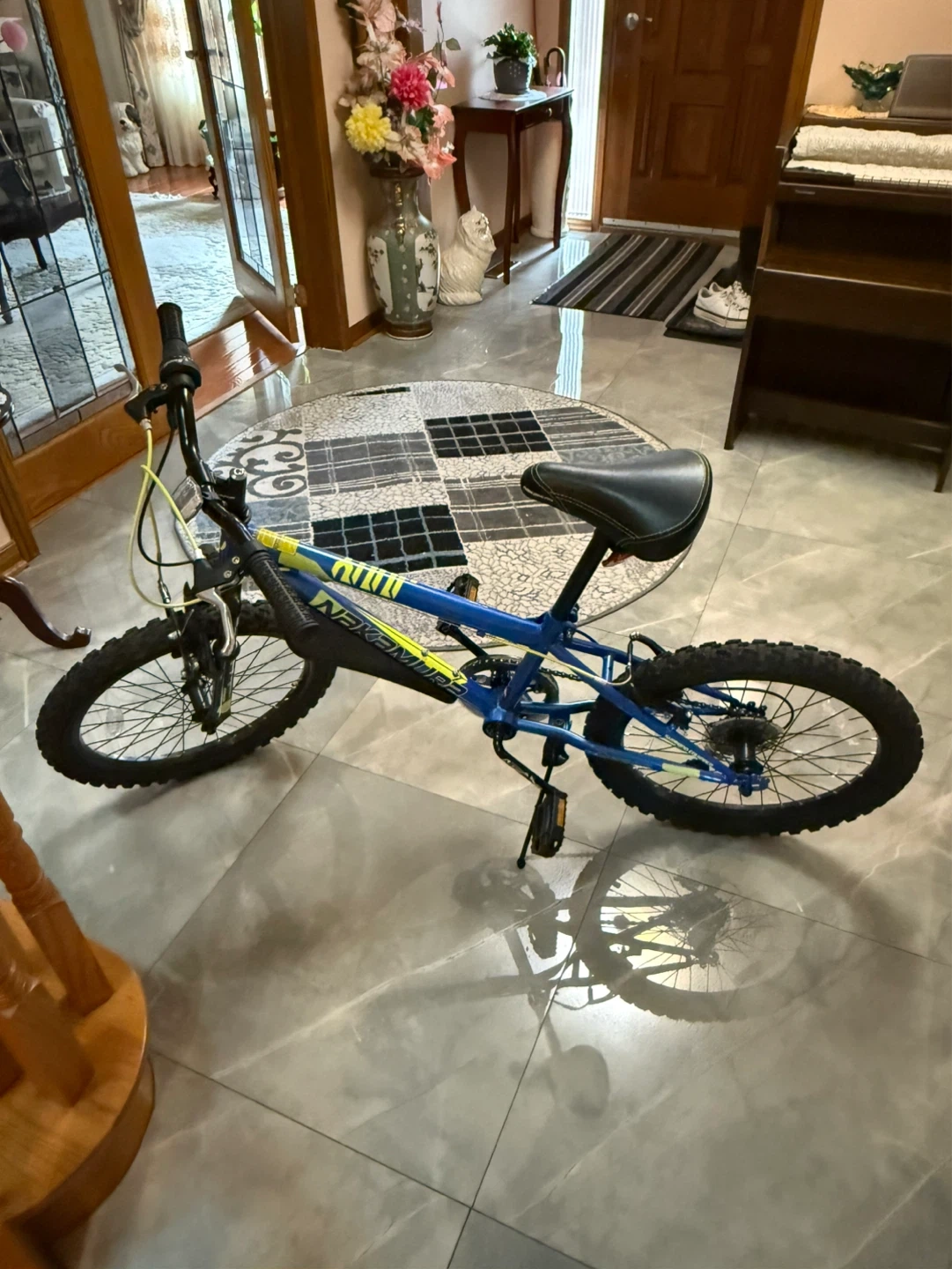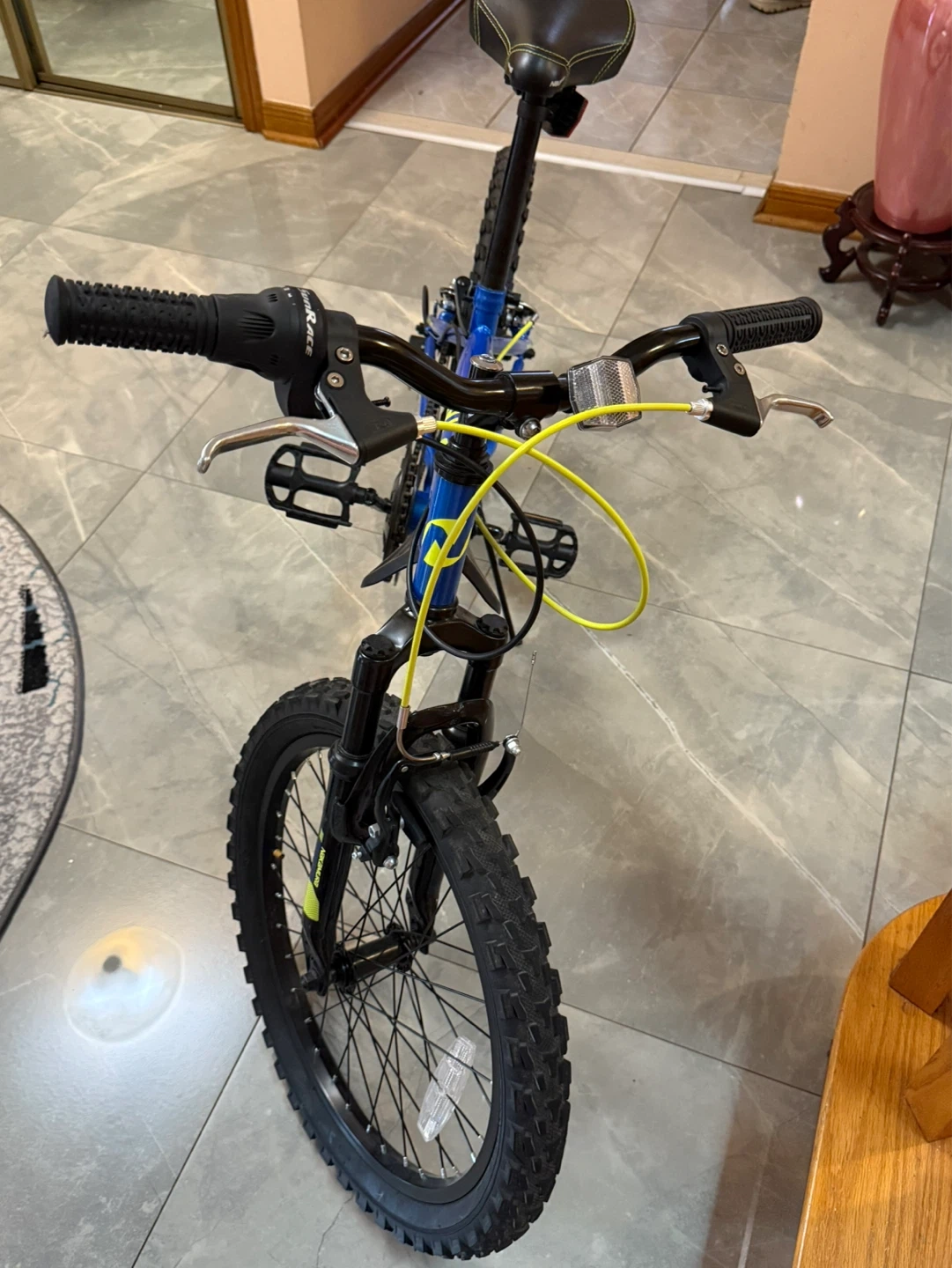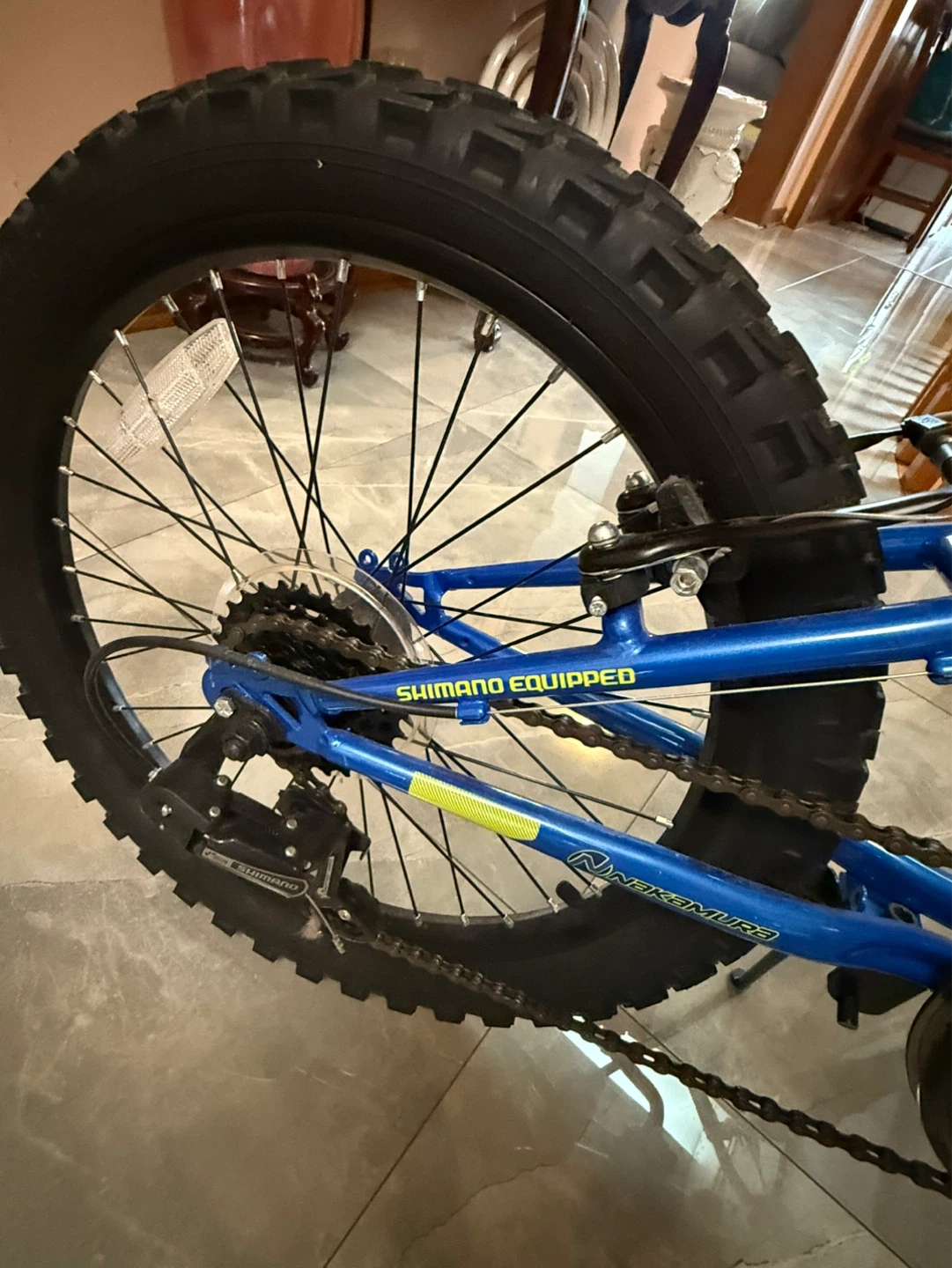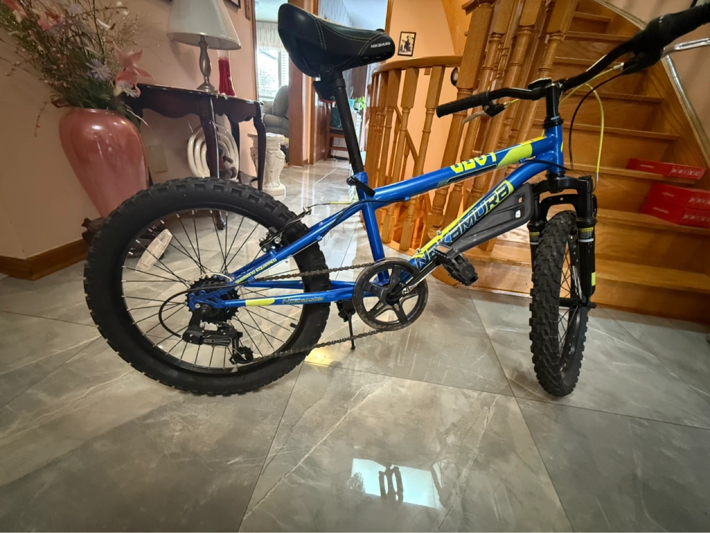 Blue Nakamura kids bike with "JUUI" graphics. Shimano equipped with 21 speeds. Perfect for young riders looking for a fun ride! 22 inches.