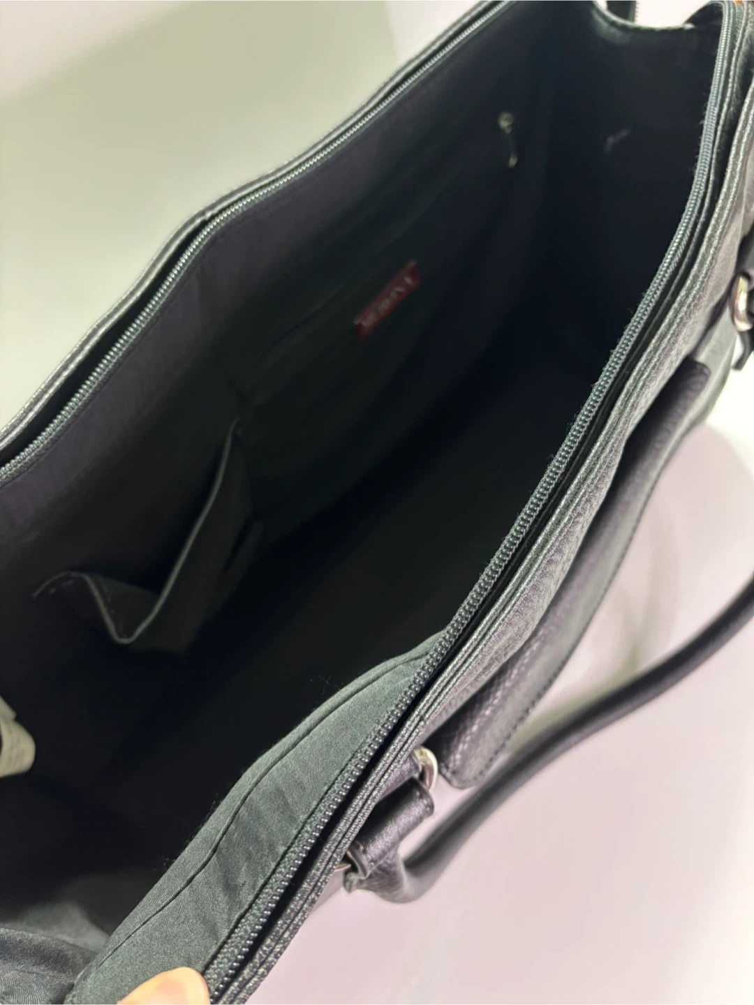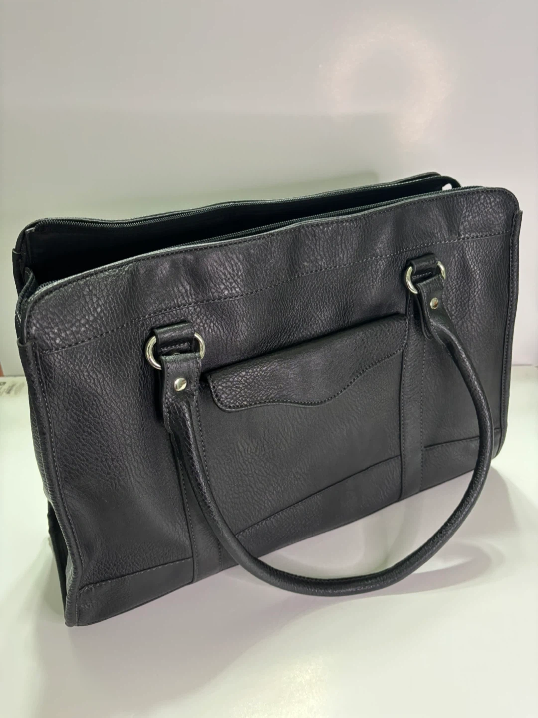 Here's a black tote bag that's perfect for work or everyday use! It's made of faux leather and has a classic, versatile look. Large enough to fit a laptop and more! It's in great condition and ready for a new home.