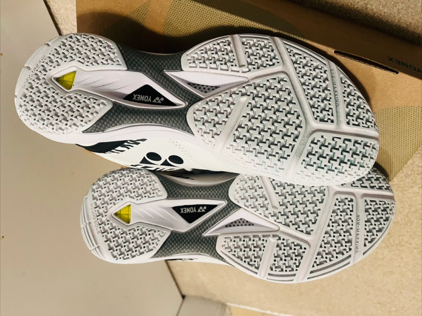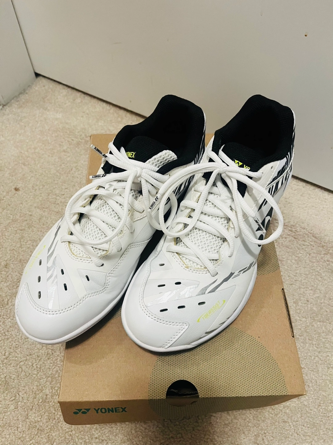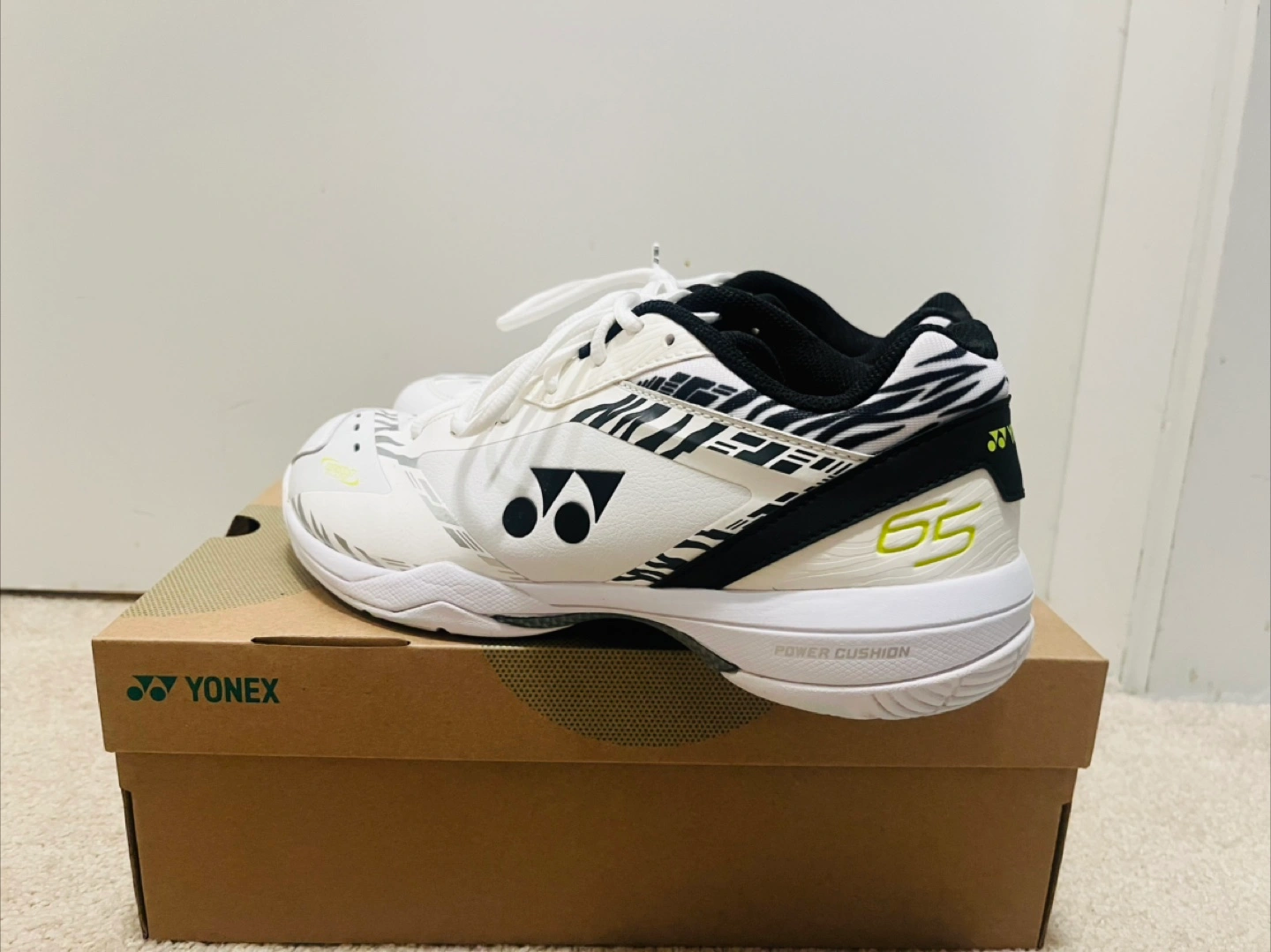 Yonex Power Cushion 65 Z badminton shoes. Men's size 8.5 US, White Tiger colourway. Excellent cushioning and support. Great for badminton or other court sports.