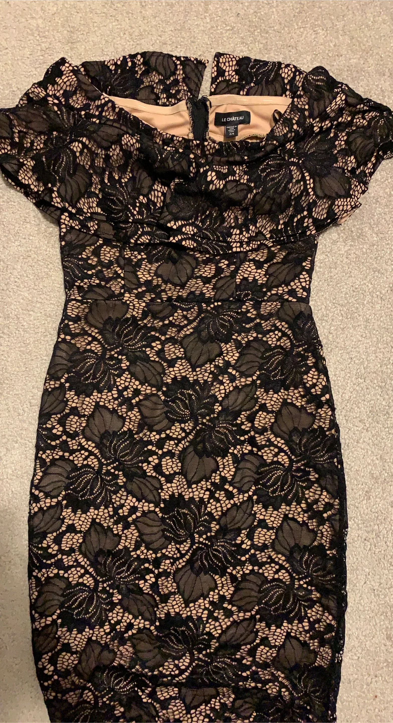 Selling a lovely Le Chateau dress! It's a petite size small and features a beautiful black lace pattern. Perfect for a night out or a special occasion!