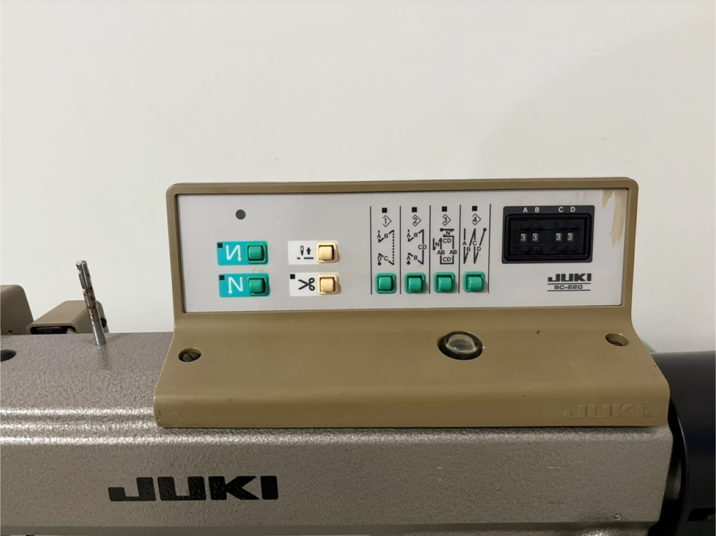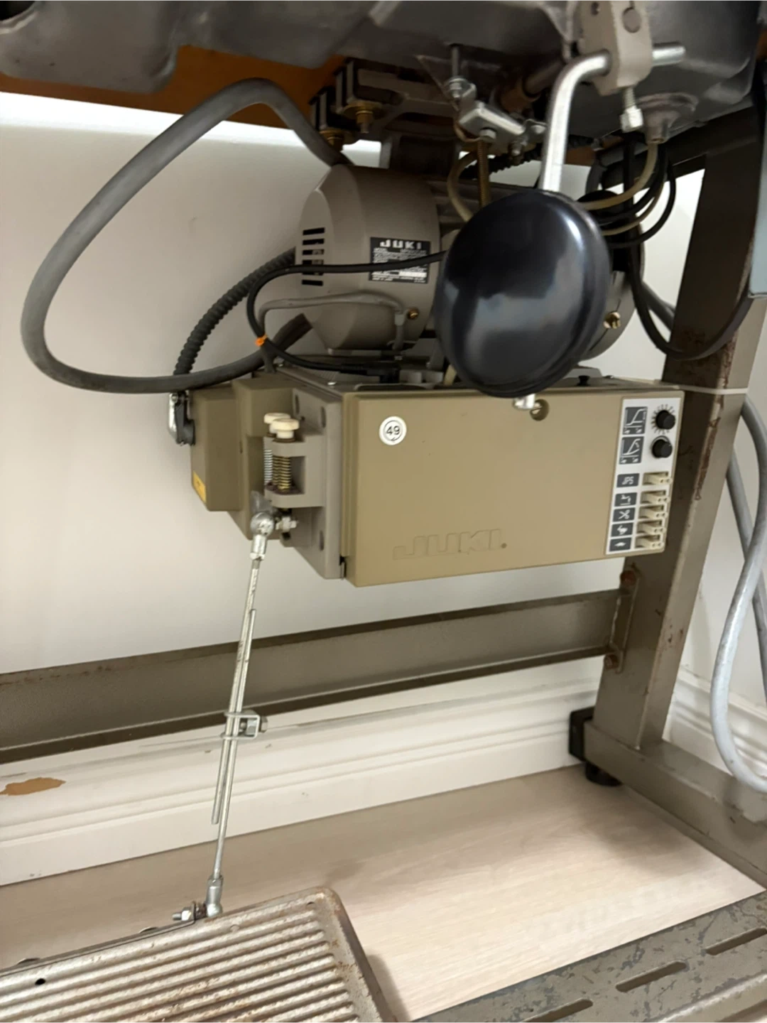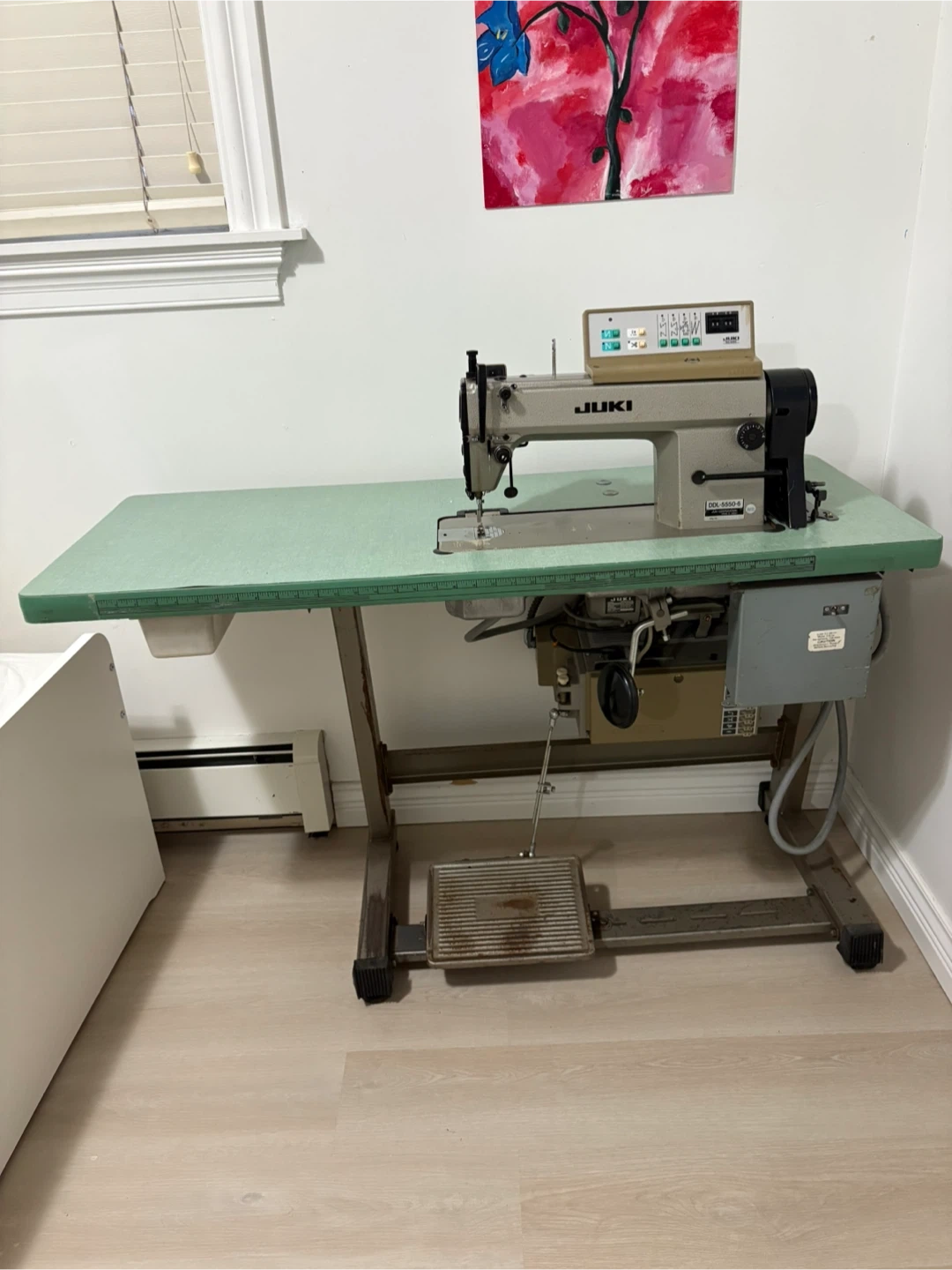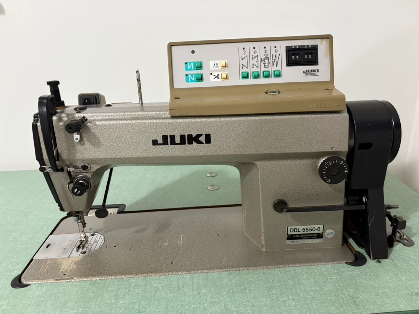 Industrial sewing machine by JUKI, model DDL-5550-6. It's a single needle machine with a control panel for stitch settings. Includes the sewing machine head, table, and motor. It cuts the thread automatically, the speed goes up and down and also the foot pressure is automatic and works perfectly.