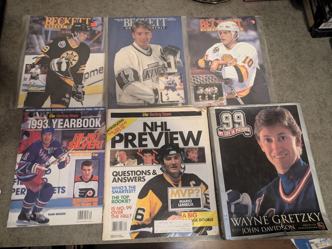 Assortment of collectible hockey magazines and books. Features various players and teams. Includes Beckett Hockey Monthly, The Hockey News, and a Wayne Gretzky biography.