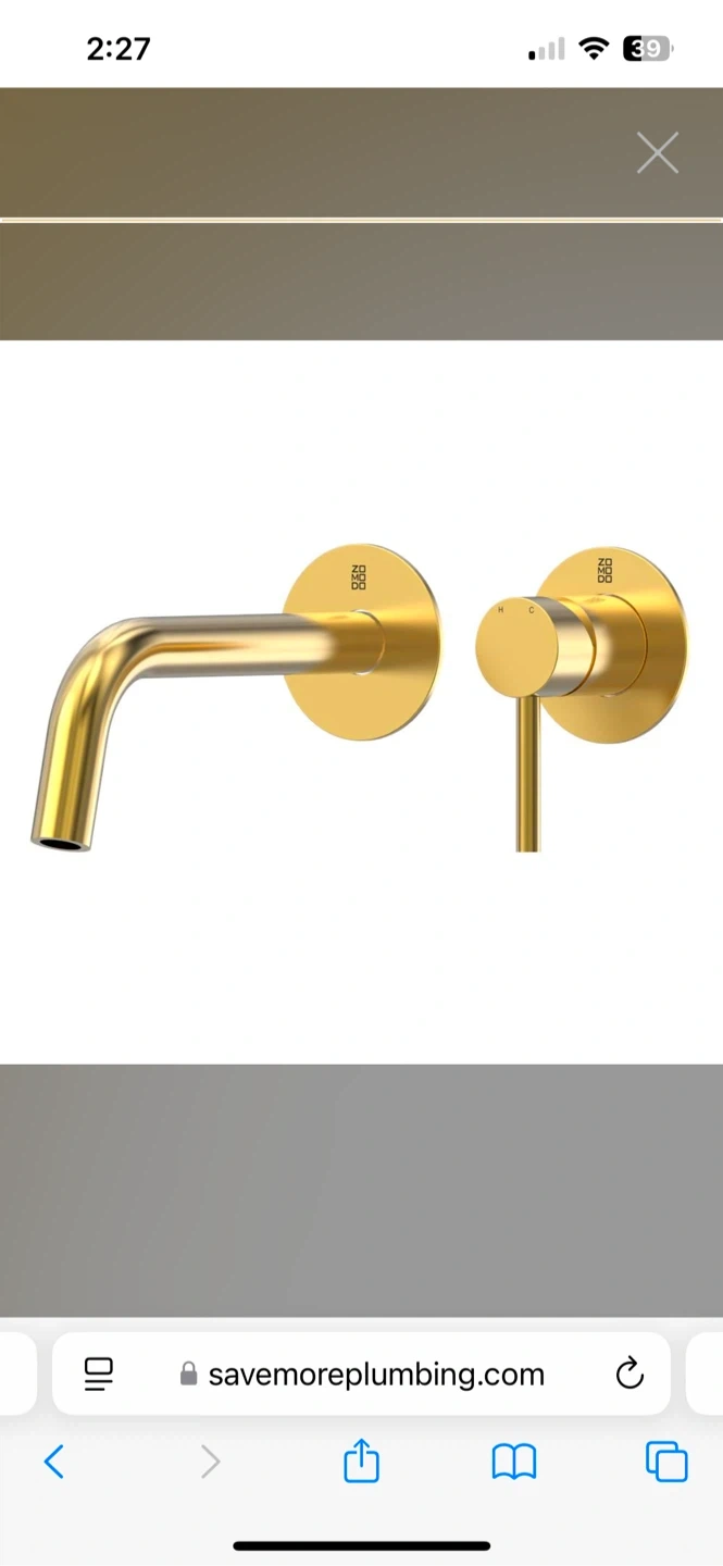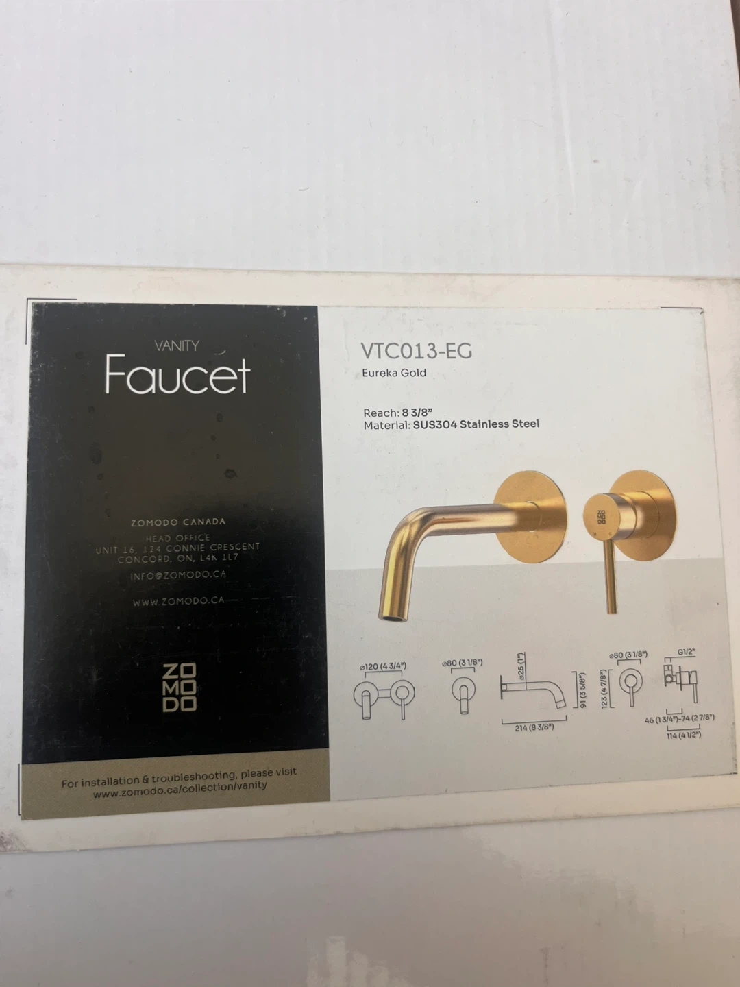 This is a Zomodo Wall-Mount Vessel/Bath Faucet in Eureka Gold. It's made from SUS304 Stainless Steel. The reach is 8 3/8". This faucet would be useful for a modern bathroom renovation.