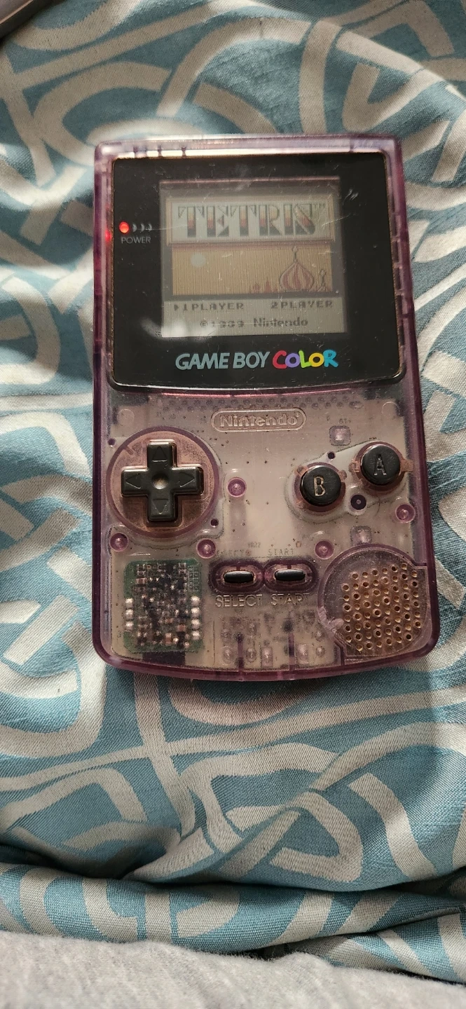 This is a purple Nintendo Game Boy Color. It's a classic handheld gaming device. It runs on AA batteries and plays original Game Boy Color cartridges. Does not have battery cover