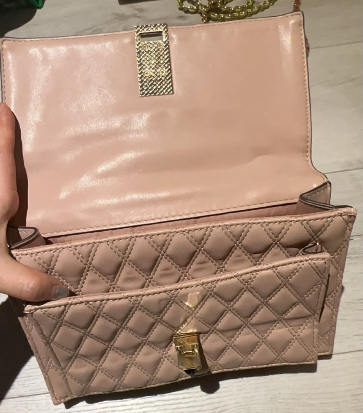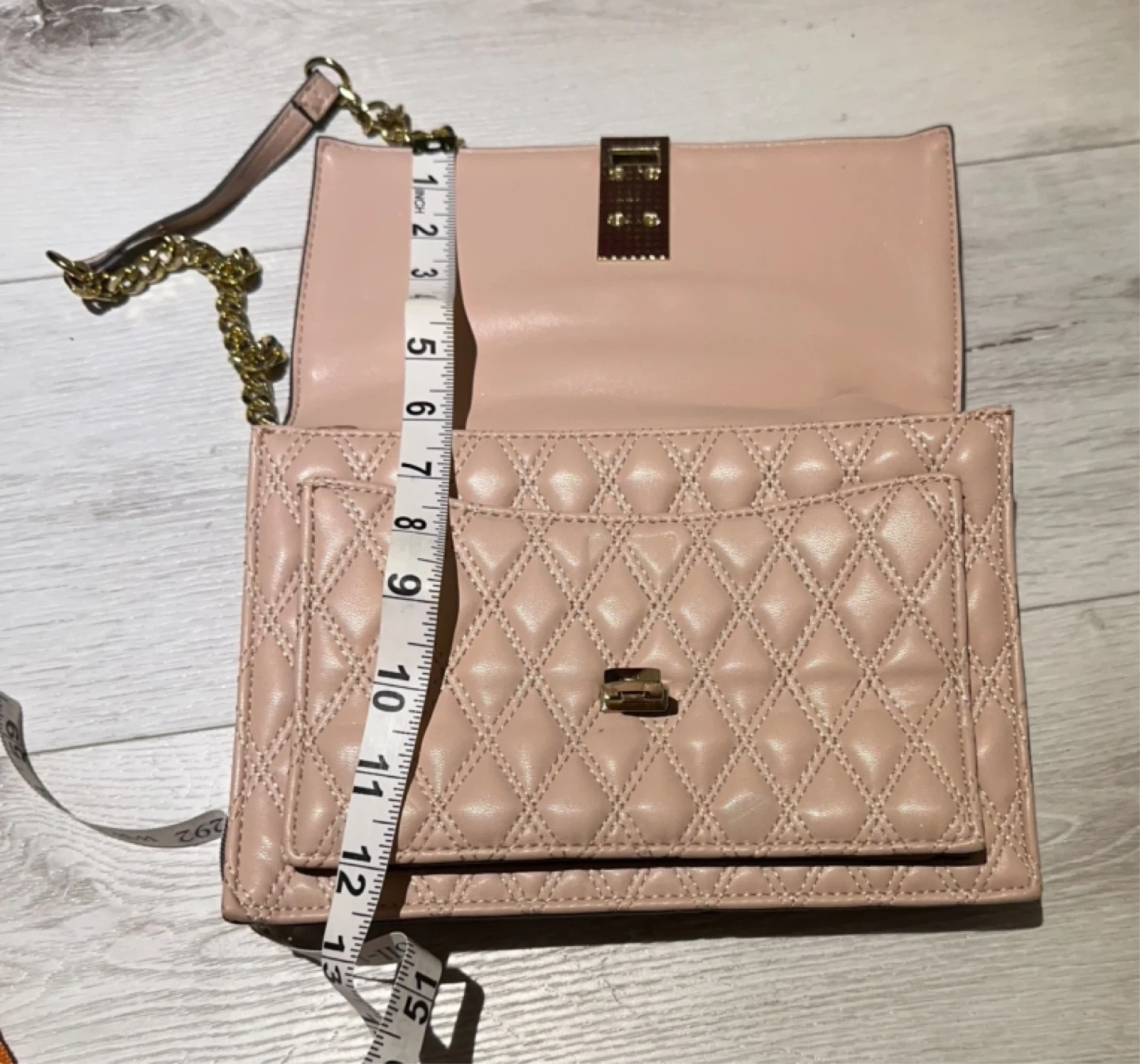 Chic ALDO shoulder bag in a pretty blush pink colour. It's made of quilted faux leather with a gold chain strap and a gold clasp closure. Dimensions: approximately 9 inches wide by 5 inches high.