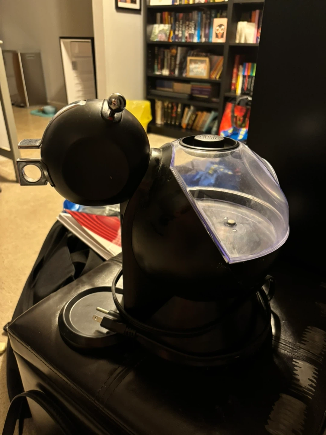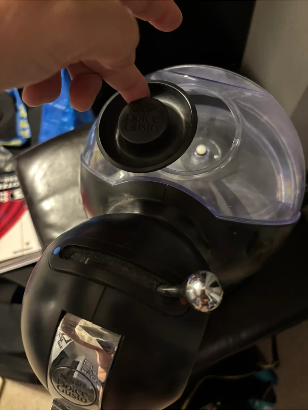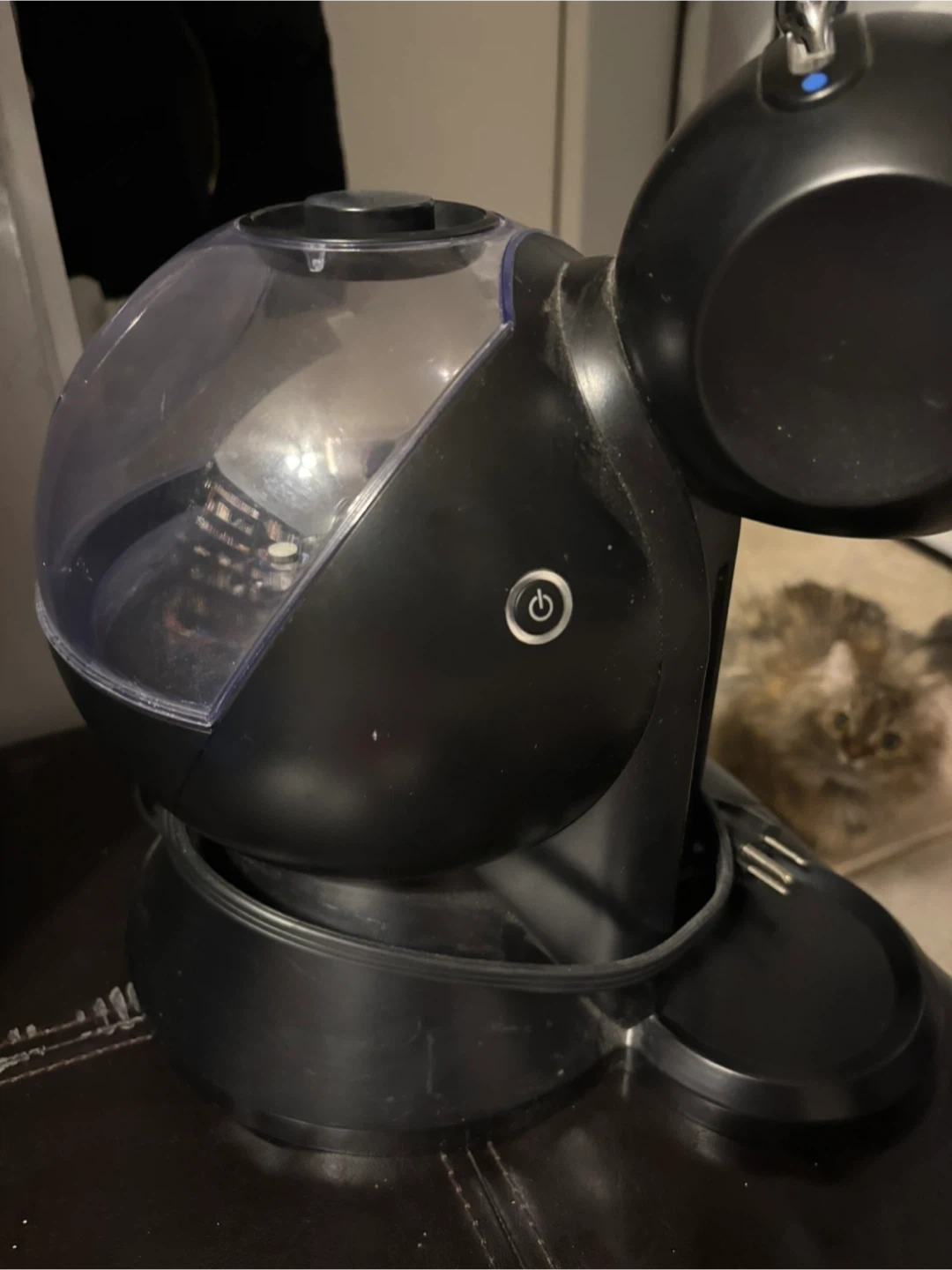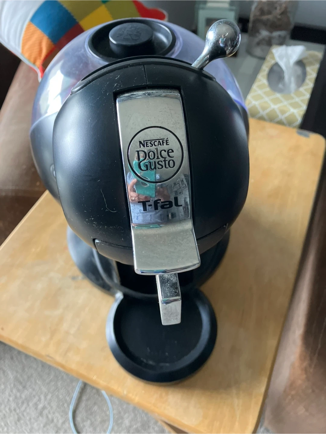 This Nescafé Dolce Gusto coffee machine is a T-fal model. It's designed for quick and easy coffee preparation. The machine has a clear water reservoir and a drip tray. It was used a lot in its day but has been in storage for about 3 years so needs to be cleaned before use.