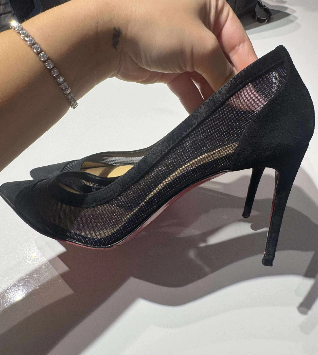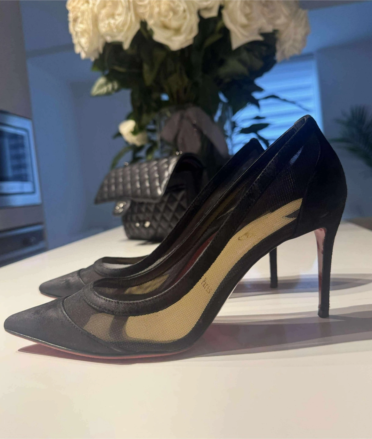 I am selling these gorgeous black heels with a mesh design. The soles are red. They would be a nice addition to any outfit