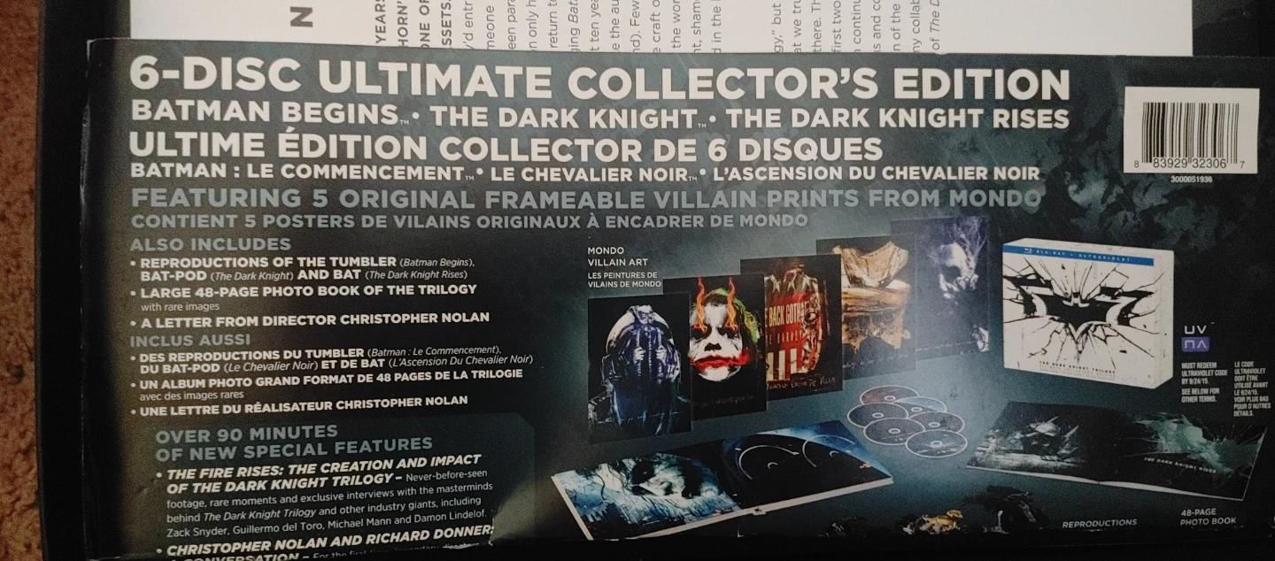 Selling a 6-disc Ultimate Collector's Edition of The Dark Knight Trilogy! This set includes Batman Begins, The Dark Knight, and The Dark Knight Rises. It features 5 original frameable villain prints from Mondo and contains 5 posters of villains. Also included are reproductions of the Tumbler, Bat-Pod, and a 48-page photo book with rare images. A letter from director Christopher Nolan is also included
