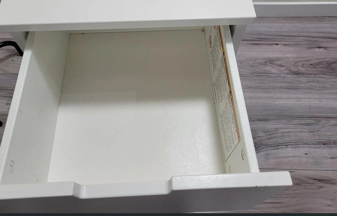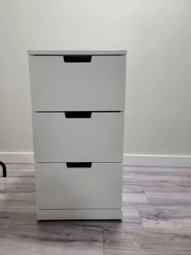 White three-drawer small cabinet for storage. It's compact and can fit under a desk. Great for organizing office supplies or personal items!