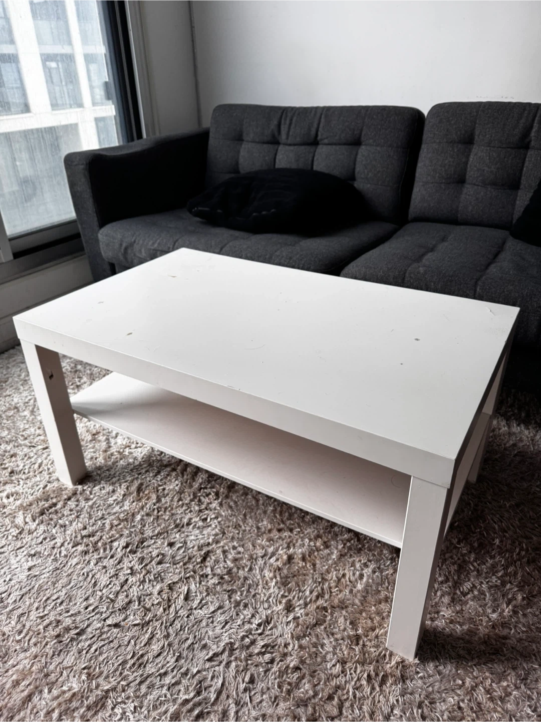 White coffee table featuring a lower shelf for extra storage. It's a simple, functional piece for your living room. Dimensions are approximately 47" L x 23" W x 18" H. Particleboard construction. Ikea coffee table white has a little scratch. Apart from that it’s in good condition